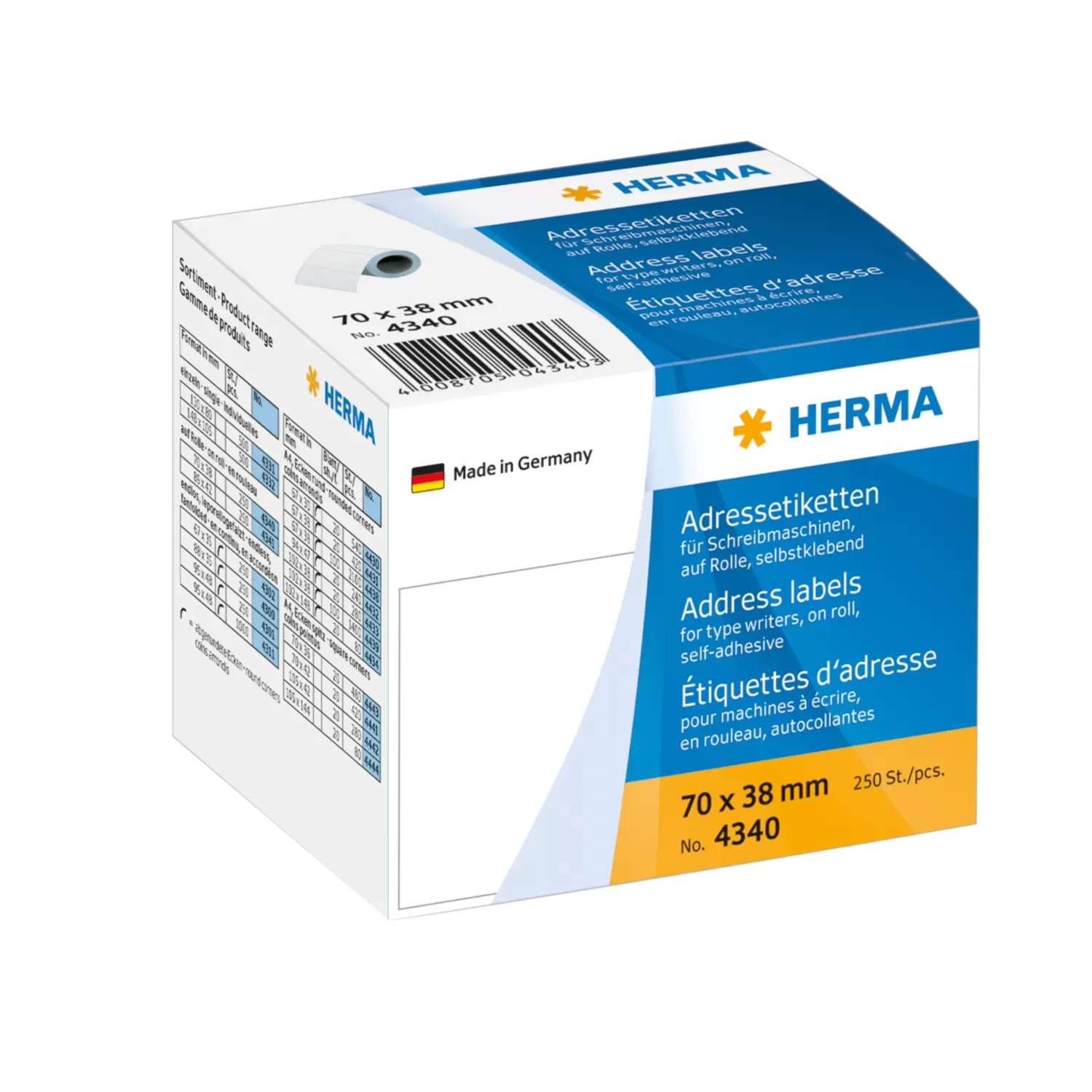 Address labels for typewriters, on rolls, 70 x 38 mm, white, permanent adhesion