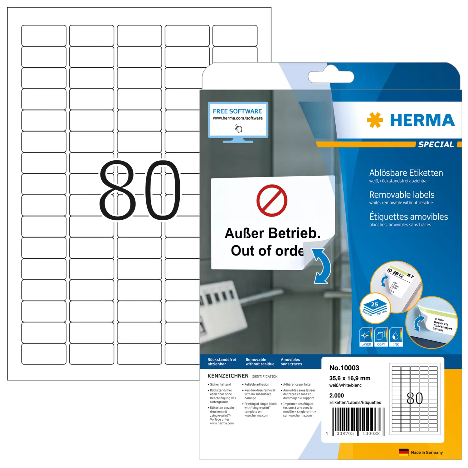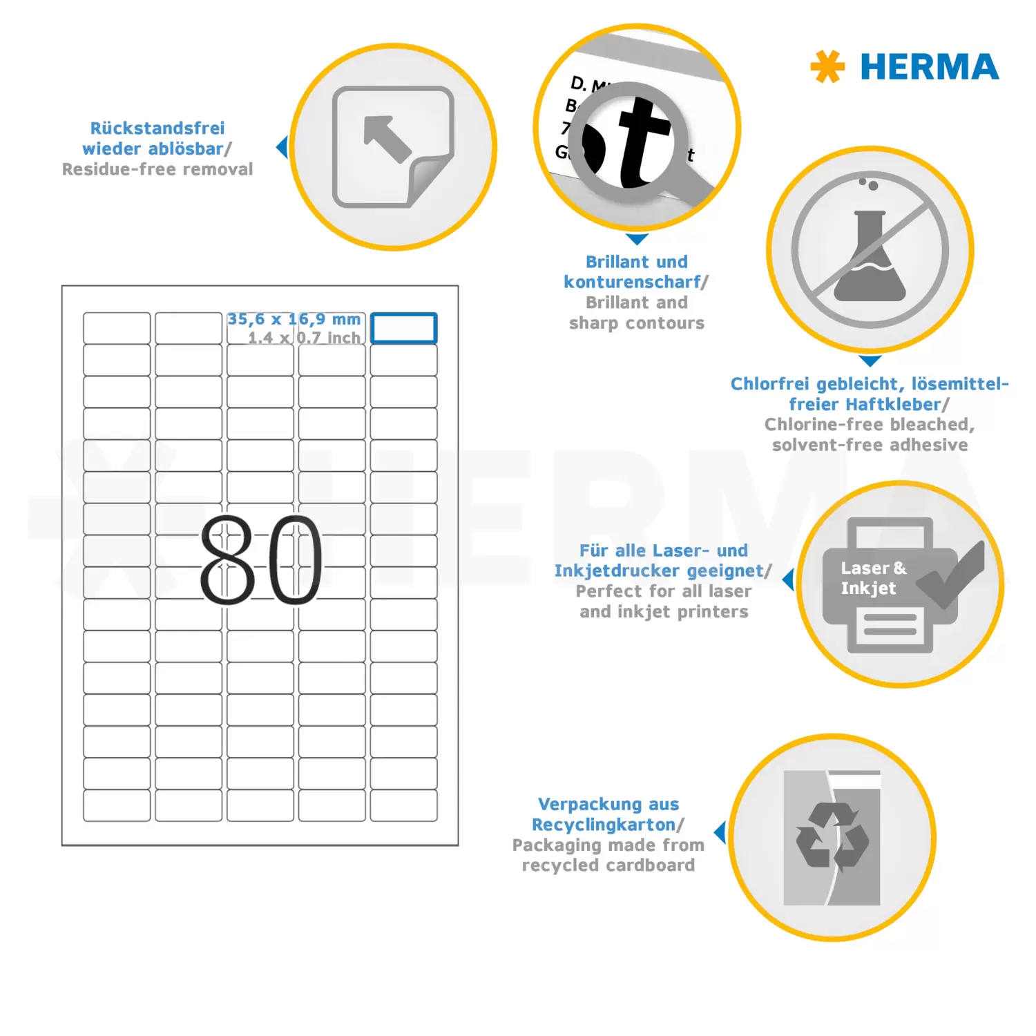 Self-adhesive labels on A4 sheets. Reliable adhesion to all smooth, dry, undamaged and dust-free surfaces. Residue-free removal without damaging the subsurface. Ideal for short-term labelling and for surfaces that must be protected from damage. Excellent printing results on all laser printers, inkjet printers, copiers, colour laser printers and colour copiers. Trouble-free processing thanks to all-round protective edge and optimum flatness. Environmentally friendly: FSC™ Mix Credit certified, chlorine-free bleached, solvent-free adhesive. Labels are 100% recyclable, dispose of as for waste paper, packaging made from recycled cardboard. Free software solutions: www.herma.com/software.