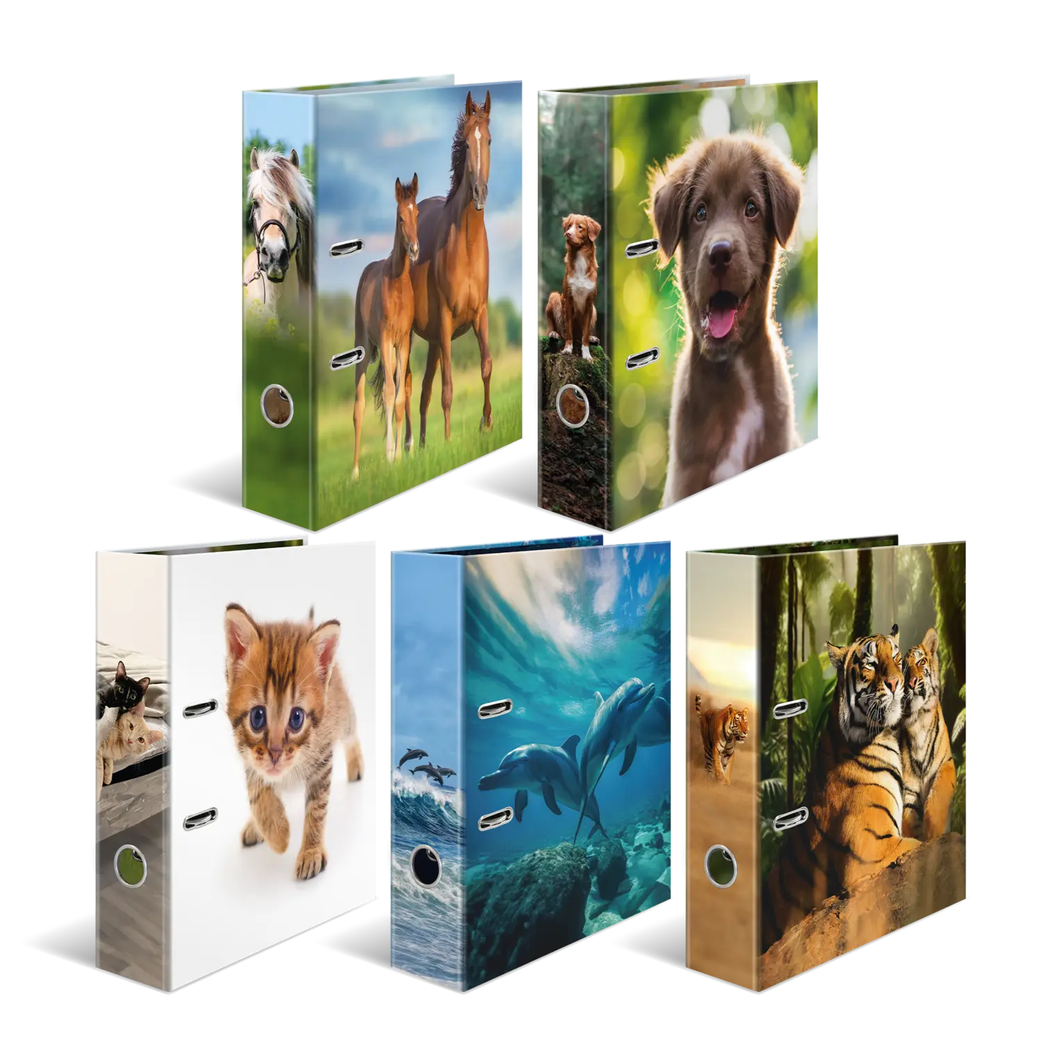 Motif file assortment favourite animals from HERMA. printed with colourful emotional designs. 10 beautiful files with 5 different motifs: horses, dogs, cats, dolphins and tigers. suitable for A4 format. with a width of 70 mm enough space for many documents and papers. optimal storage. high quality workmanship with inner print and lever arch mechanism. made of sturdy cardboard. ideal for the desk and for the shelf.