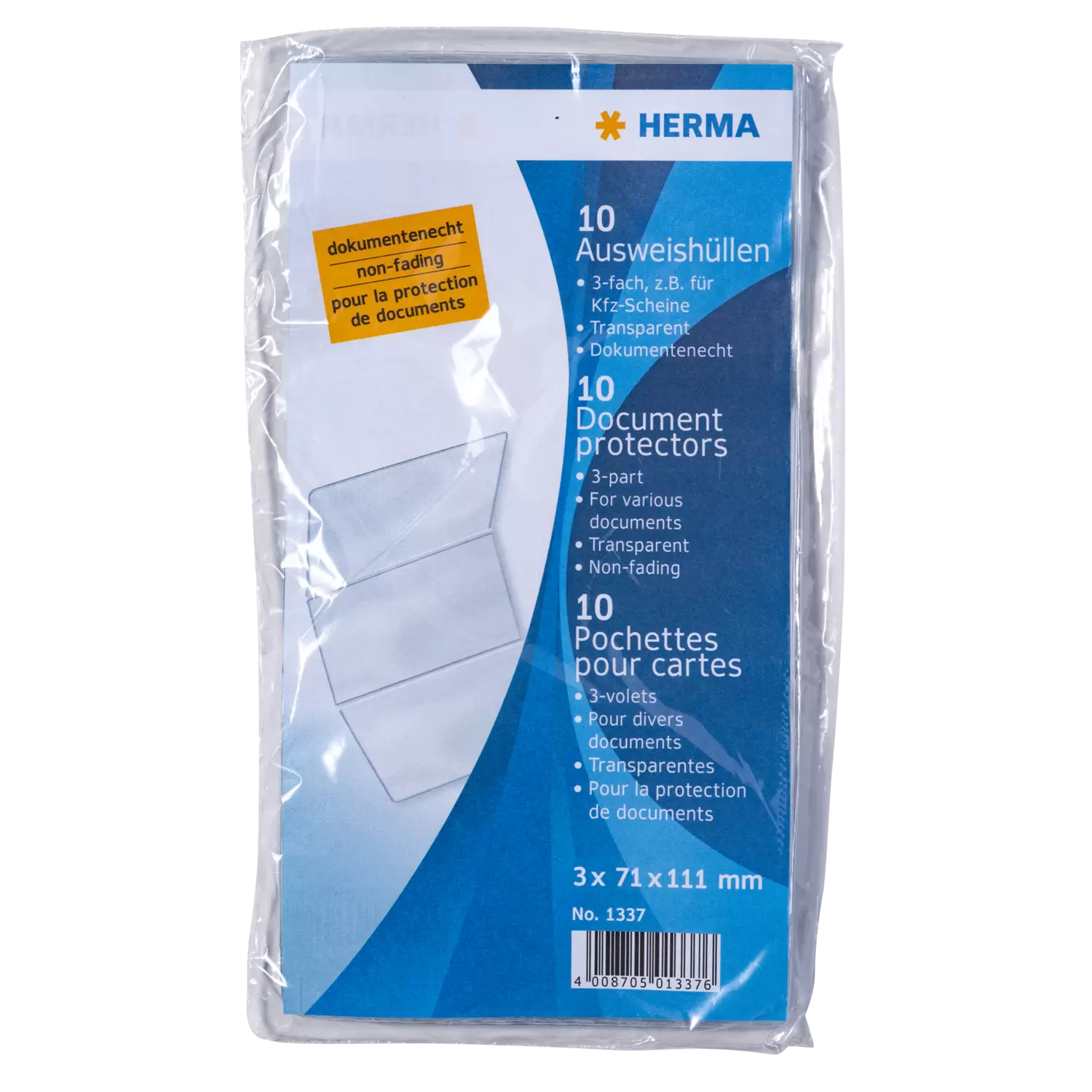 Documents, ID cards as well as bank, credit and other important cards should be well protected and safely stored. The HERMA 3-part flap sleeve made of transparent polypropylene film is ideal for vehicle documents and more in the format 3 x 71 x 111 mm. The cover is center-folded with convenient insertion tabs on the right and left. The document cover is extremely hard-wearing and sturdy, document-proof, tear-resistant, odor-free and protects against moisture, dirt and wear, even when on the move in your wallet, purse or pocket. That is HERMA quality Made in Germany.