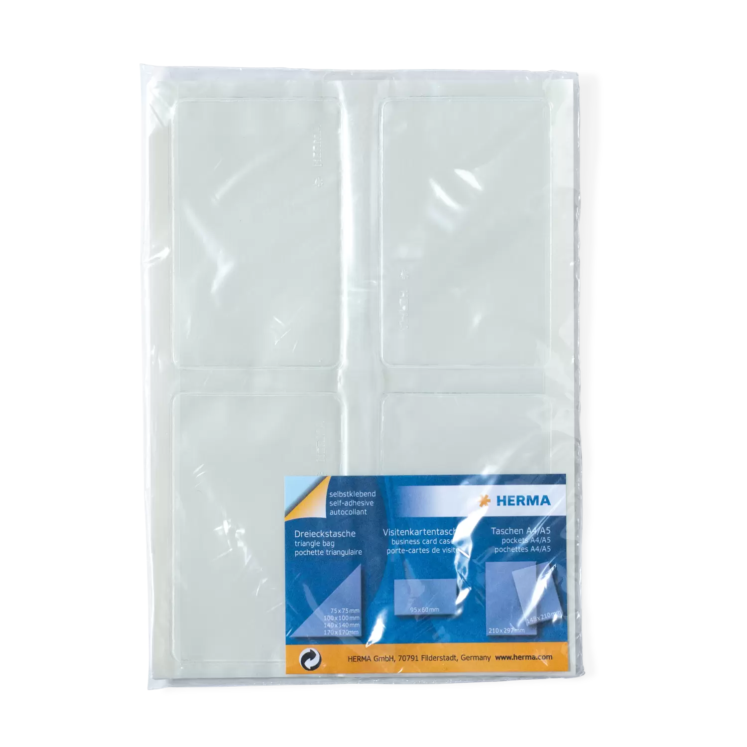 The practical extra pocket for sticking in albums, files and ring binders, offer and presentation folders: HERMA's transparent business card pockets. The pockets in the format 95 x 60 mm are made of crystal-clear polypropylene film and are ideal for cards of different types. The pockets are easy to attach, self-adhesive and adhere firmly to smooth surfaces. So business cards or other cards are always at hand. Simply peel off the backing paper, stick the pocket in the position you want, insert cards and use previously unused space wisely. Clever and practical.