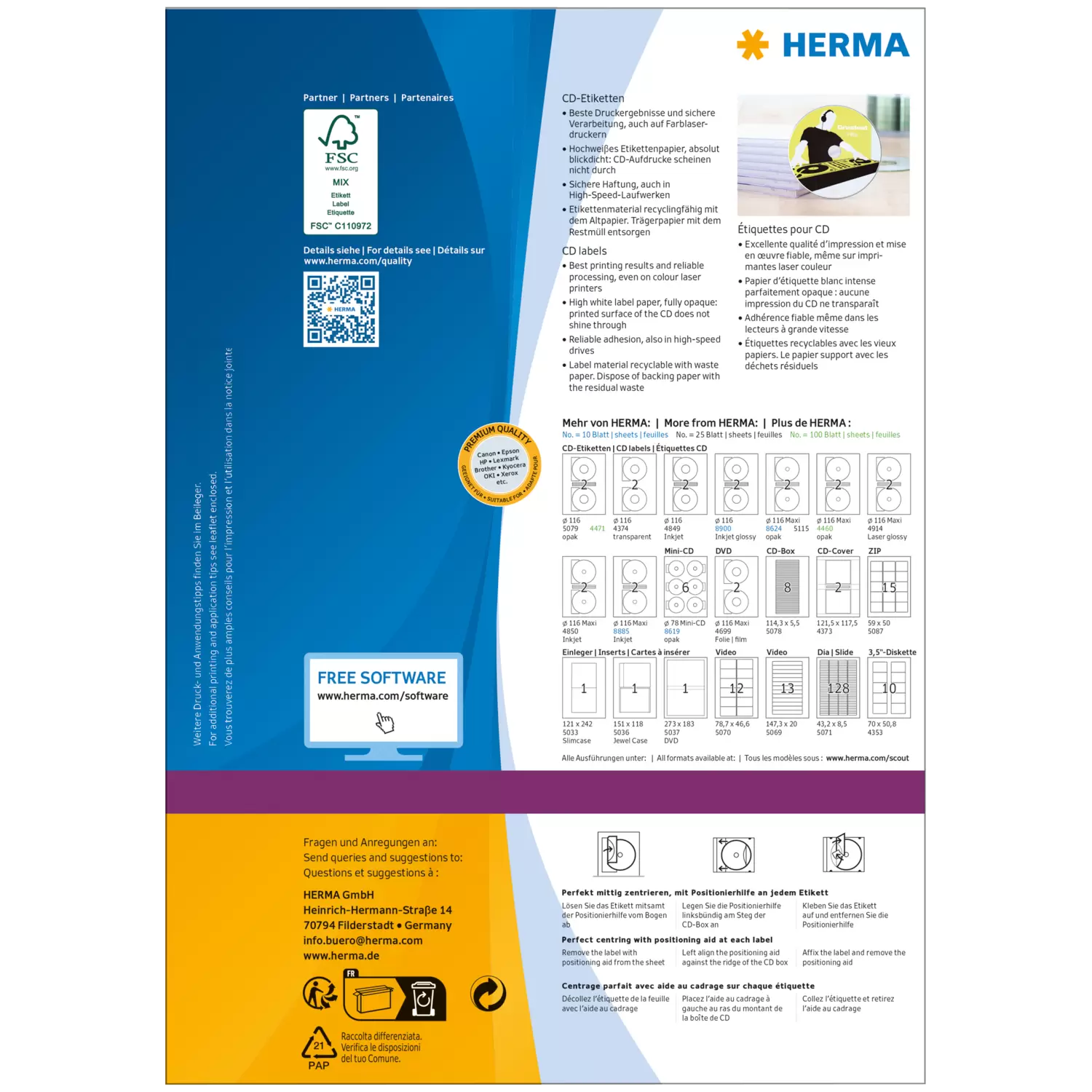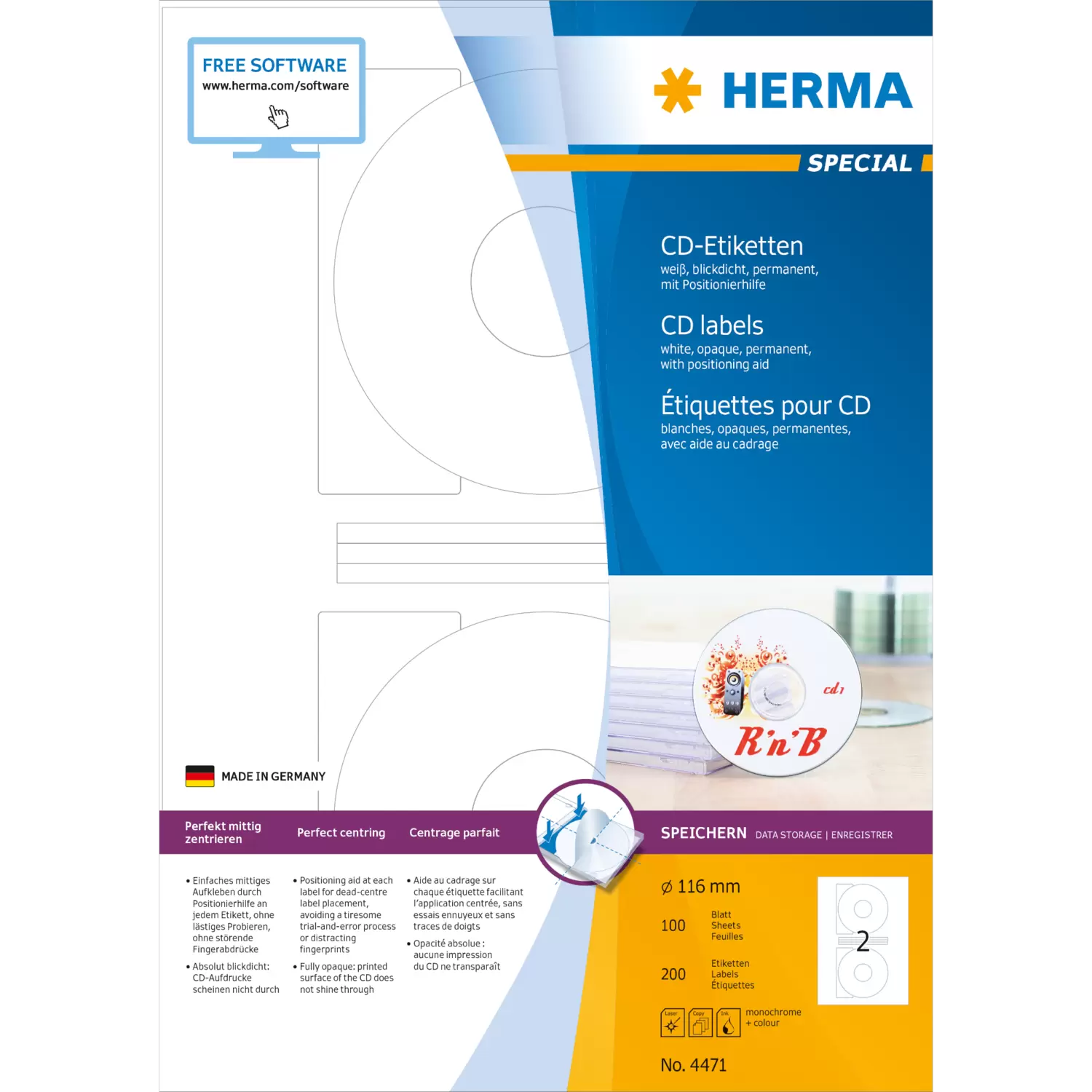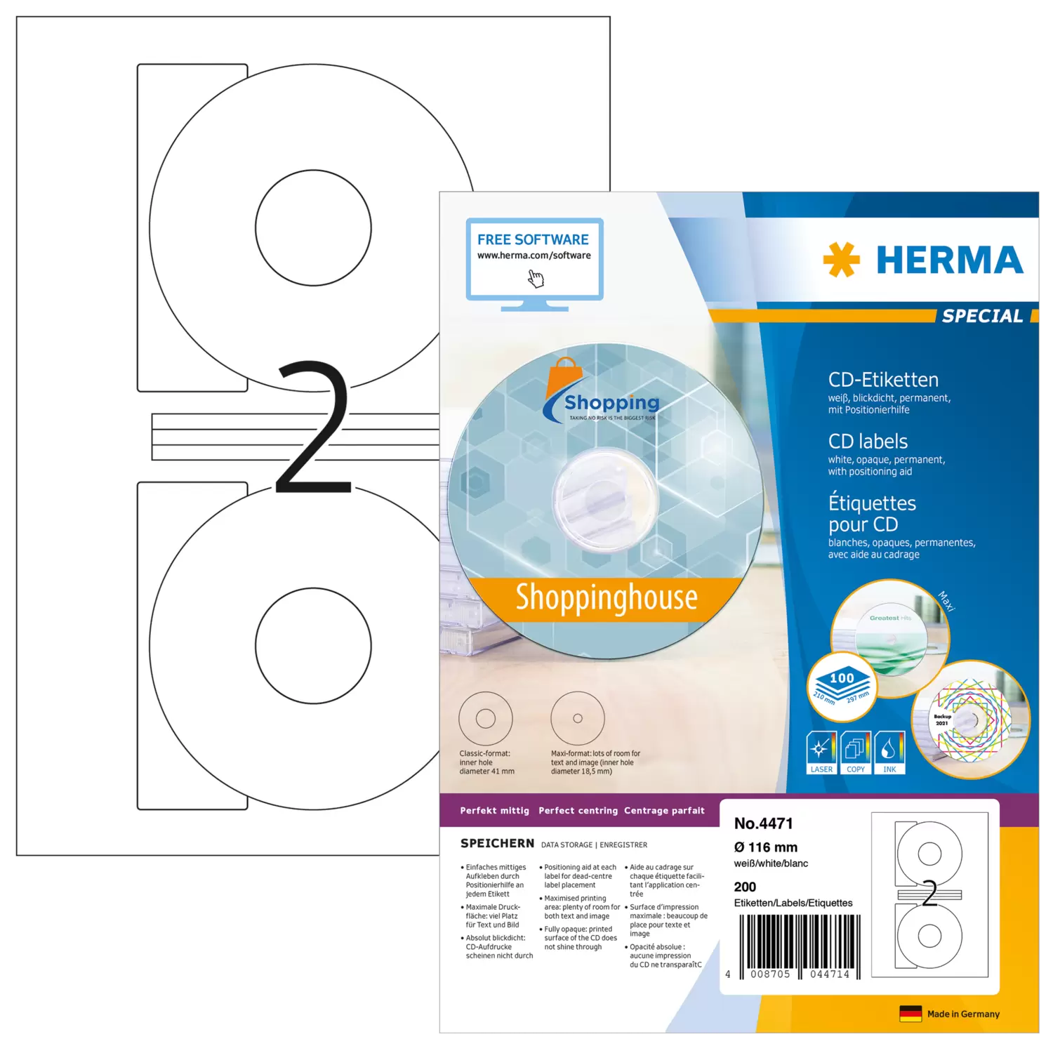 CD labels Maxi A4, Ø 116 mm, white opaque, permanent adhesion