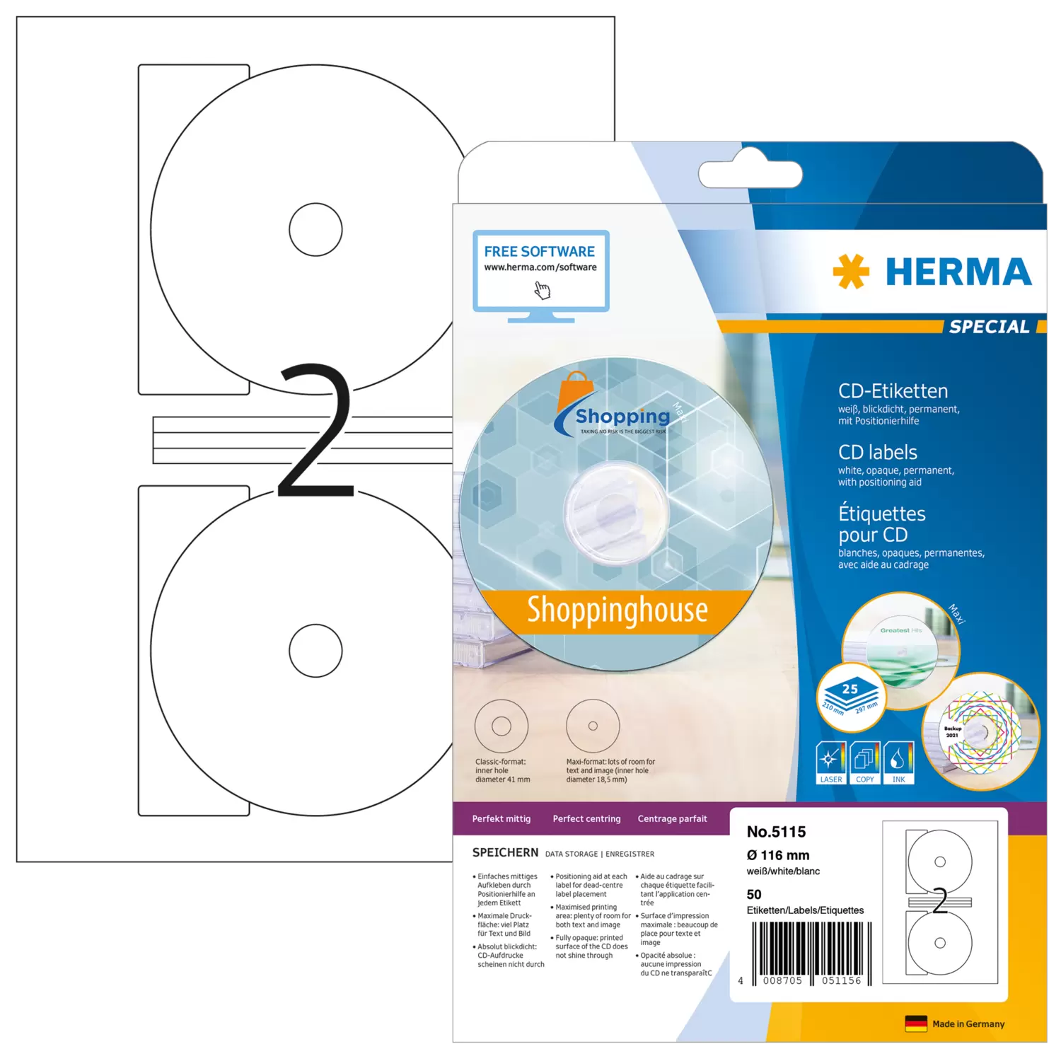 CD labels Maxi A4, Ø 116 mm, white opaque, permanent adhesion