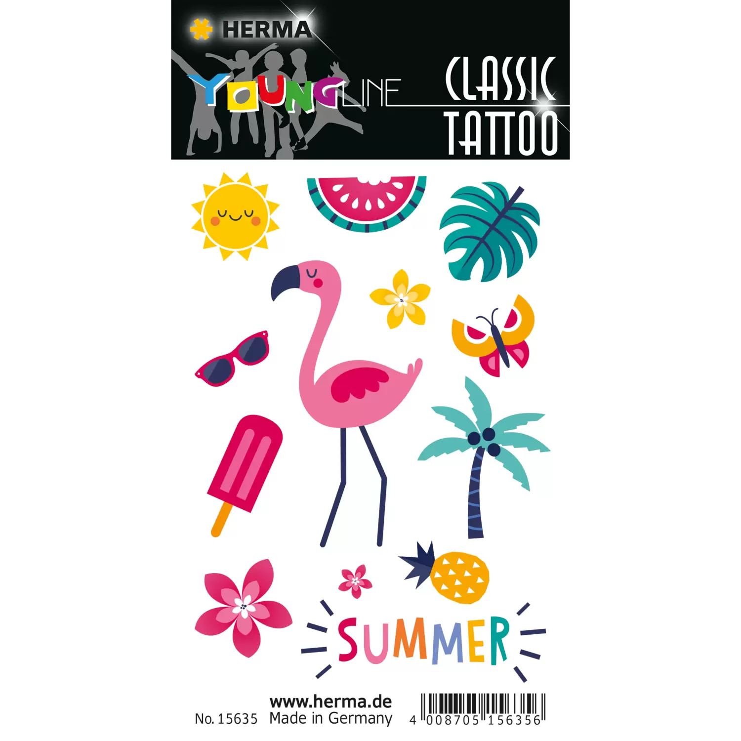 Tattoos don't have to be permanent: adhesive tattoos create imaginative motifs on the skin - but only temporarily. Skin-friendly, easy to apply and even easier to remove: these are the cool adhesive tattoos from HERMA. Cut out the chosen tattoo, peel off the protective film and position on the part of the skin you want, press on firmly with a damp tissue for 30 seconds and peel off - that's all. The tattoos are waterproof and last for several days on the skin. They are also very easy to wash off: just put some skin or cooking oil on a tissue and gently wipe over the tattoo and it will be removed without leaving any residue. Great fun for young and old! Summer comes into your home and onto your skin with the "Summerfeeling" adhesive tattoos. The beautifully drawn tattoos in cheerful summery colours are fun and bring a happy spirit. Let the sun shine!