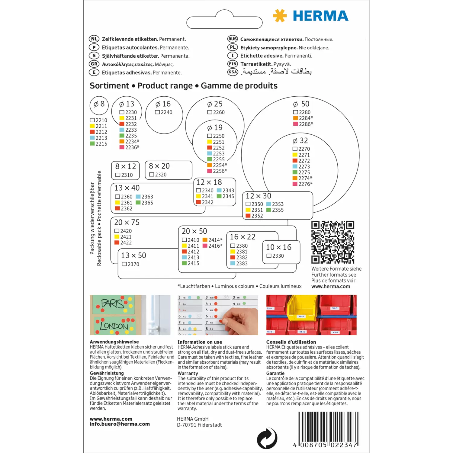 Multi-purpose labels to mark and or organize. Environmentally friendly: high-quality paper, chlorine-free bleached, with solvent-free adhesive. Coloured labels FSC™ Mix Credit certified. Secure adhesion on all surfaces. Sheet size 111 x 170 mm. For hand inscription with any writing item and typewriter. Not suitable for PC printers, please use HERMA PREMIUM A4 labels.
