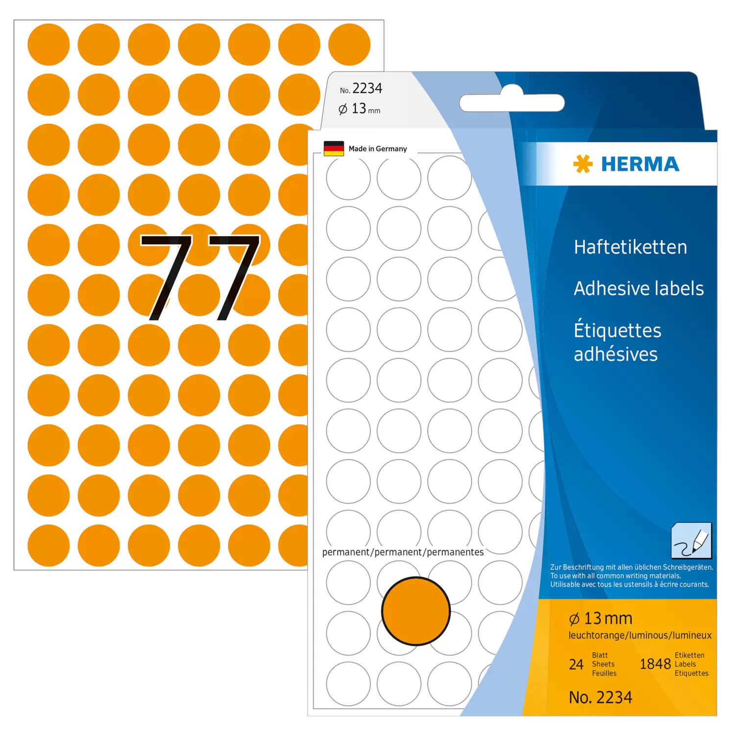 Multi-purpose labels / colour dots, Ø 13 mm, round, luminous orange, permanent adhesion, for hand le