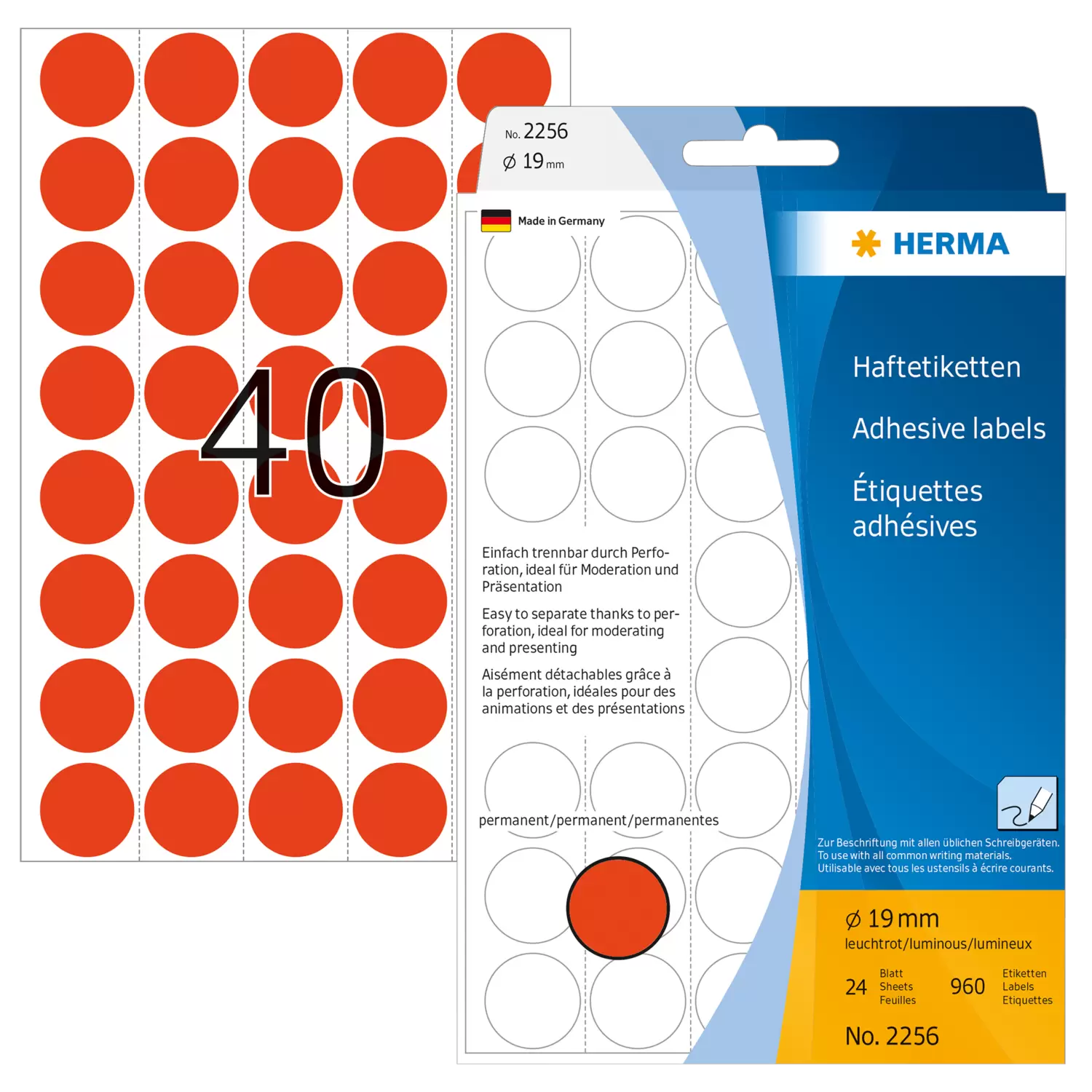 Multi-purpose labels / colour dots, Ø 19 mm, round, luminous red, paper matt backing perforated