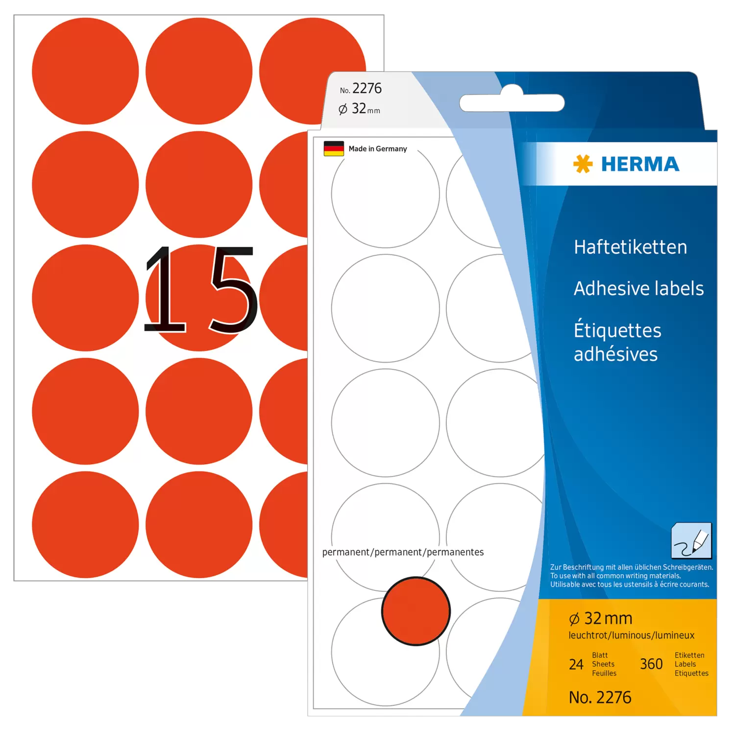 Multi-purpose labels / colour dots, Ø 32 mm, round, luminous red, permanent adhesion, for hand lette