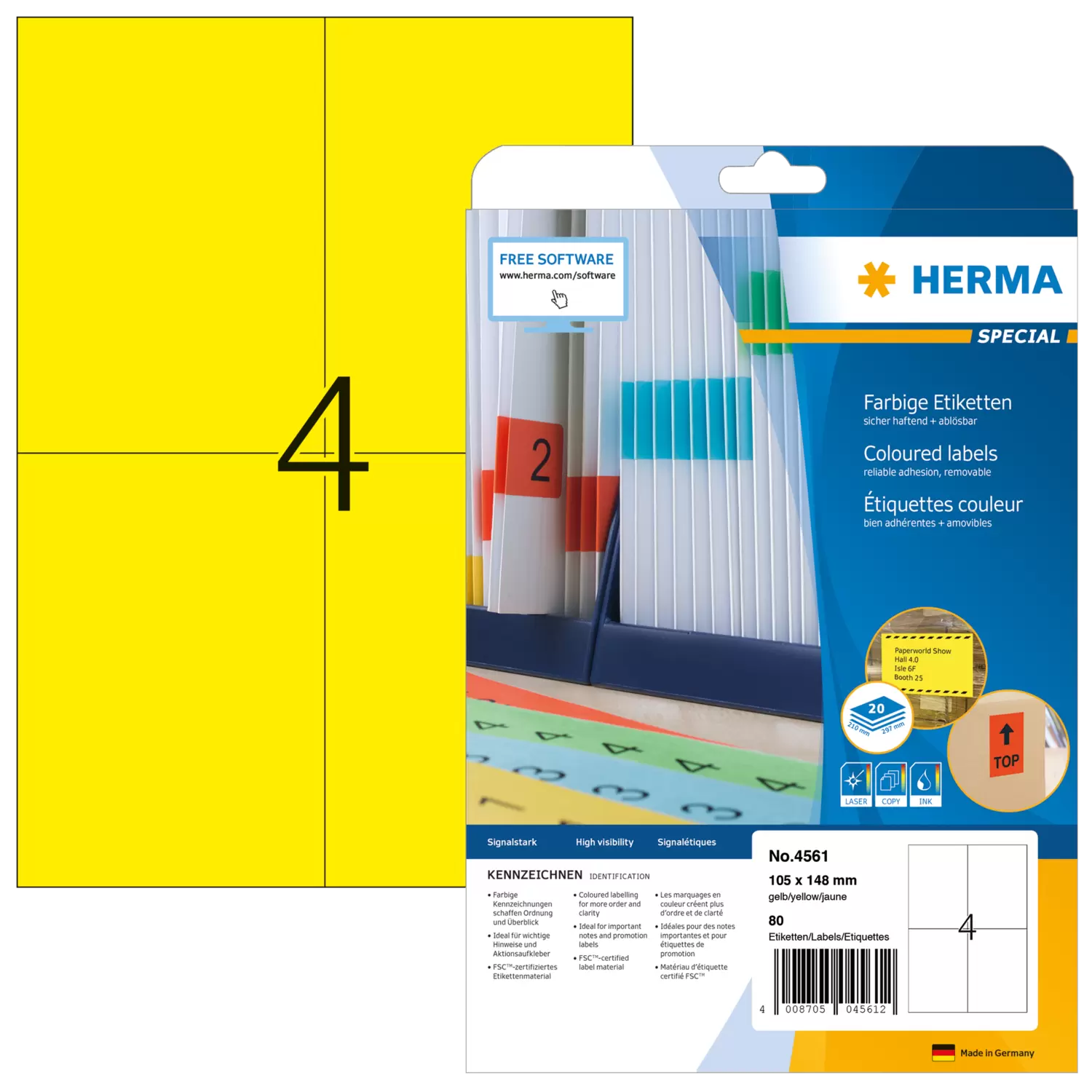 Coloured labels A4, 105 x 148 mm, yellow, removable