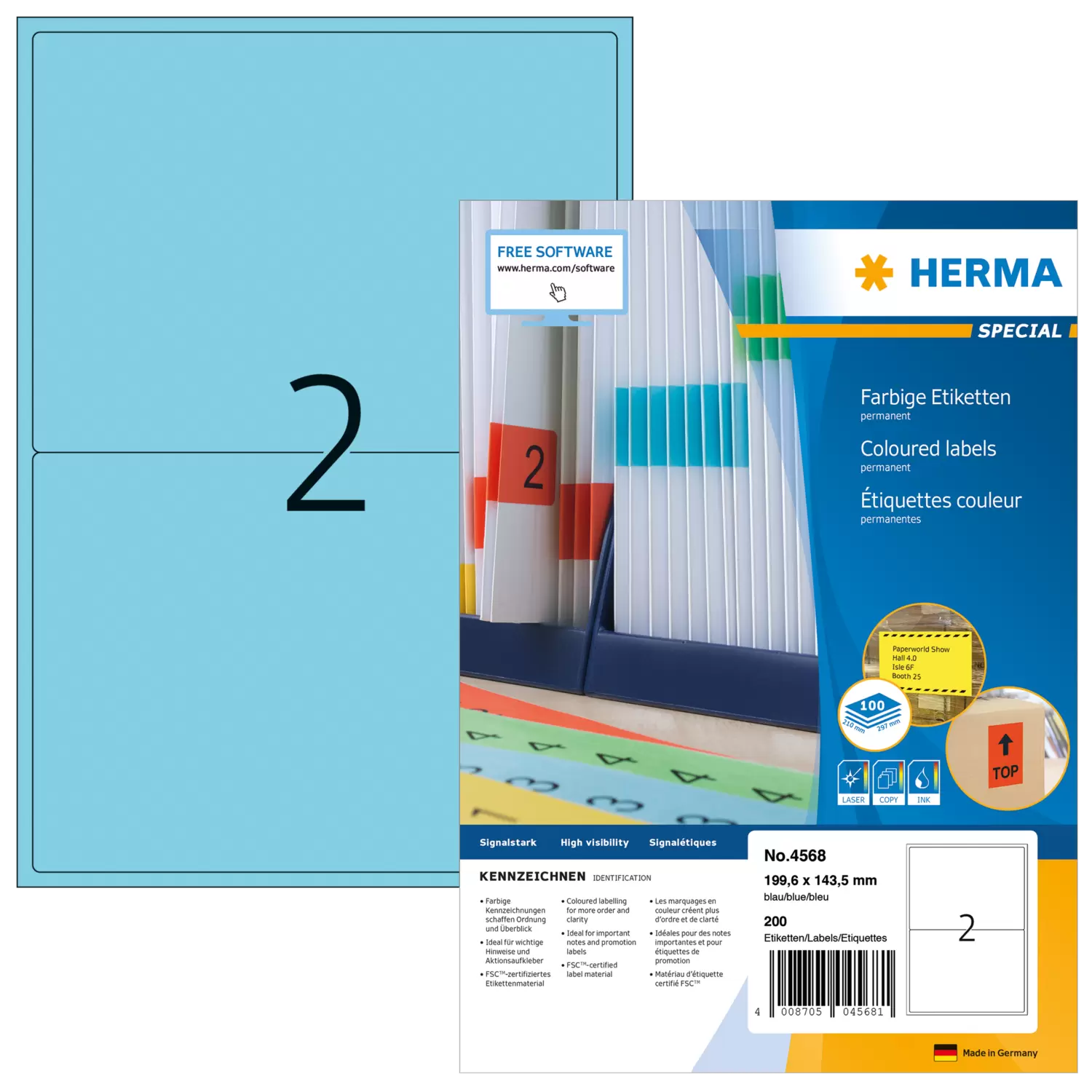 Coloured labels on A4 sheets, self-adhesive. Ideal for labels used as signals, e.g. warning notices, urgent memos, change of address, coloured coding, promotions... Environmentally friendly: FSC™ Mix Credit certified label paper, chlorine-free bleached, solvent-free adhesive. Labels are 100% recyclable, dispose of as for waste paper, packaging made from recycled cardboard. Excellent printing results on all laser printers, inkjet printers, copiers, colour laser printers and colour copiers. Trouble-free processing thanks to all-round protective edge and optimum flatness. Free software solutions: www.herma.com/software.