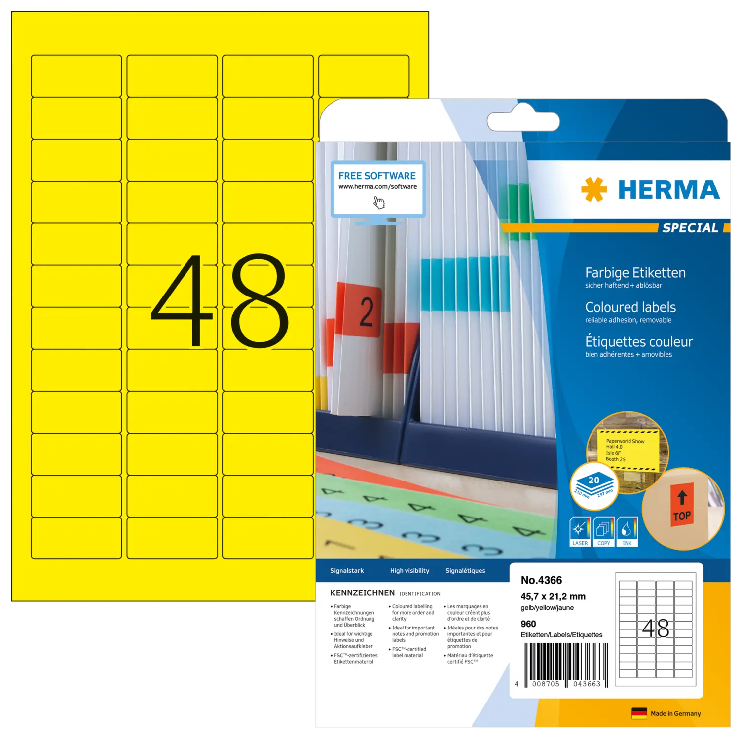 Coloured labels A4, 45,7 x 21,2 mm, yellow, removable