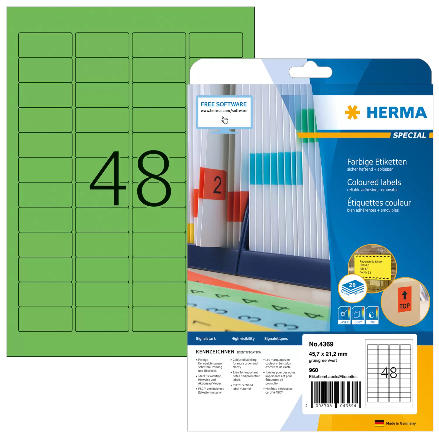 Coloured labels A4, 45,7 x 21,2 mm, green, removable