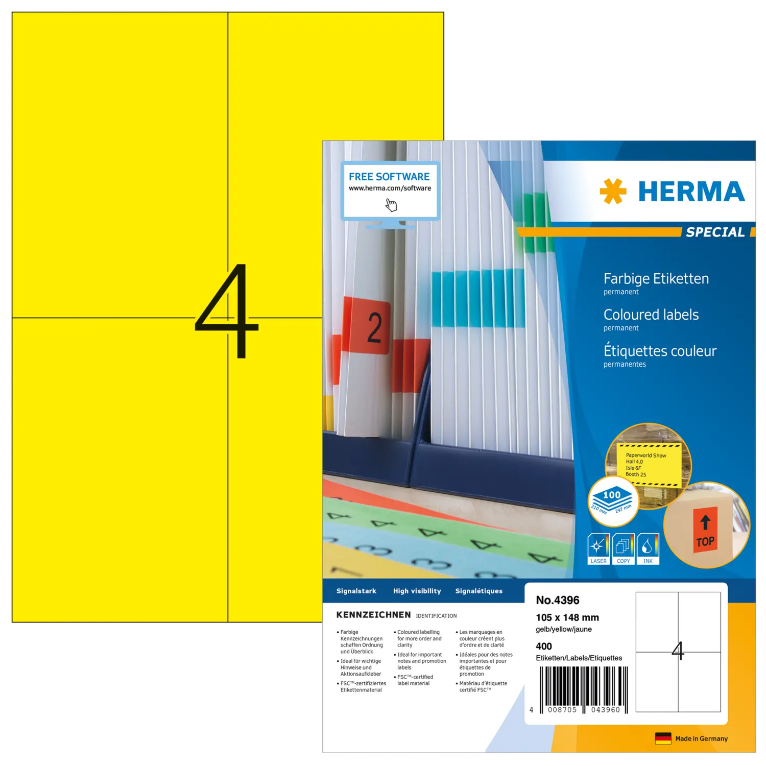 Coloured labels A4, 105 x 148 mm, yellow, permanent adhesion