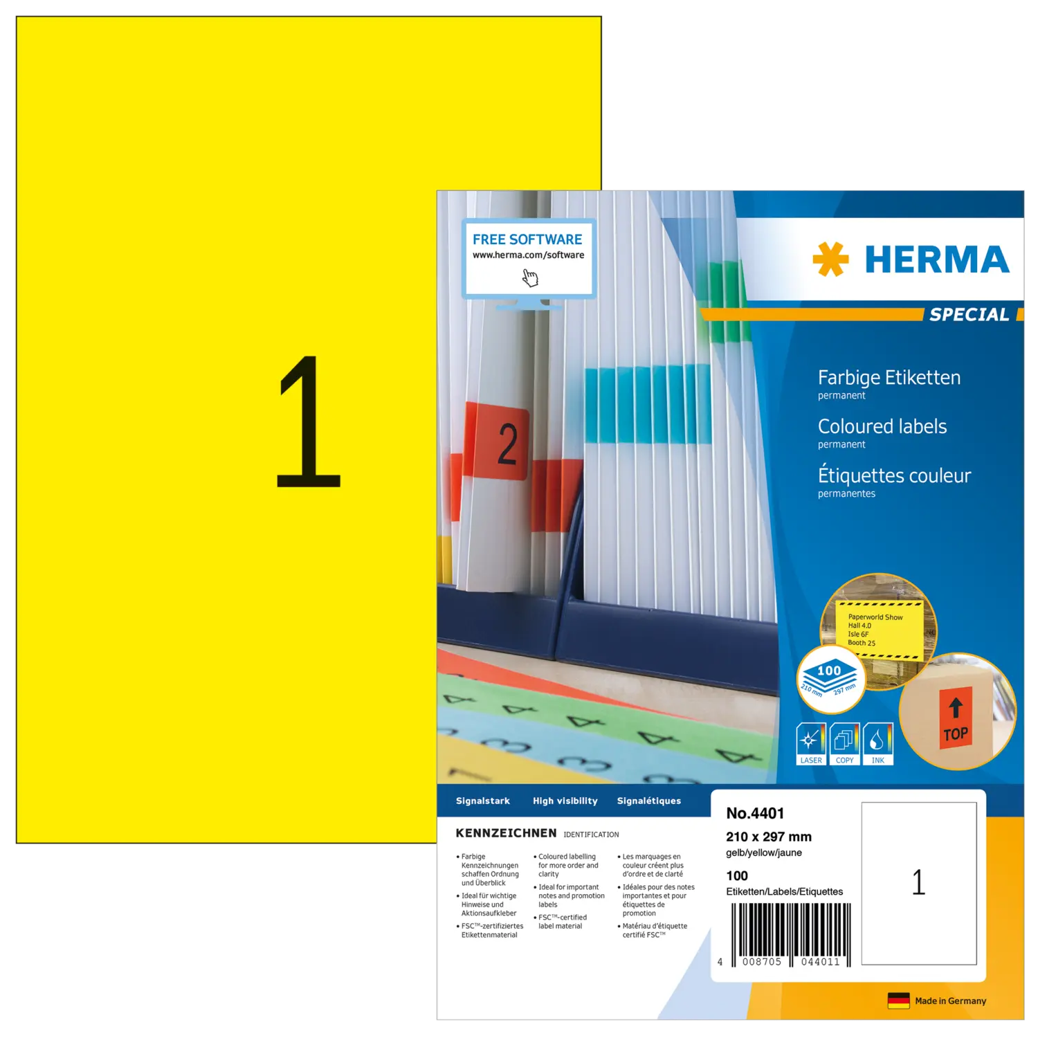 Coloured labels A4, 210 x 297 mm, yellow, permanent adhesion