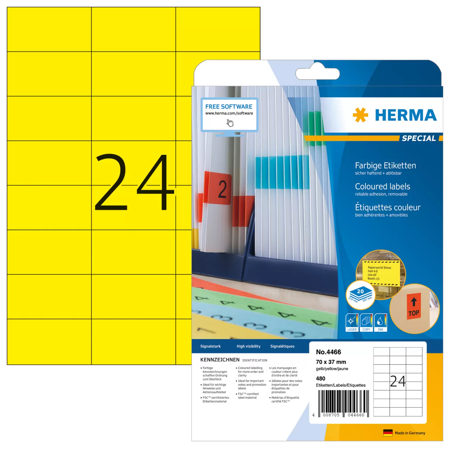 Coloured labels on A4 sheets, self-adhesive. Ideal for labels used as signals, e.g. warning notices, urgent memos, change of address, coloured coding, promotions... Environmentally friendly: FSC™ Mix Credit certified label paper, chlorine-free bleached, solvent-free adhesive. Labels are 100% recyclable, dispose of as for waste paper, packaging made from recycled cardboard. Excellent printing results on all laser printers, inkjet printers, copiers, colour laser printers and colour copiers. Trouble-free processing thanks to all-round protective edge and optimum flatness. Free software solutions: www.herma.com/software.
