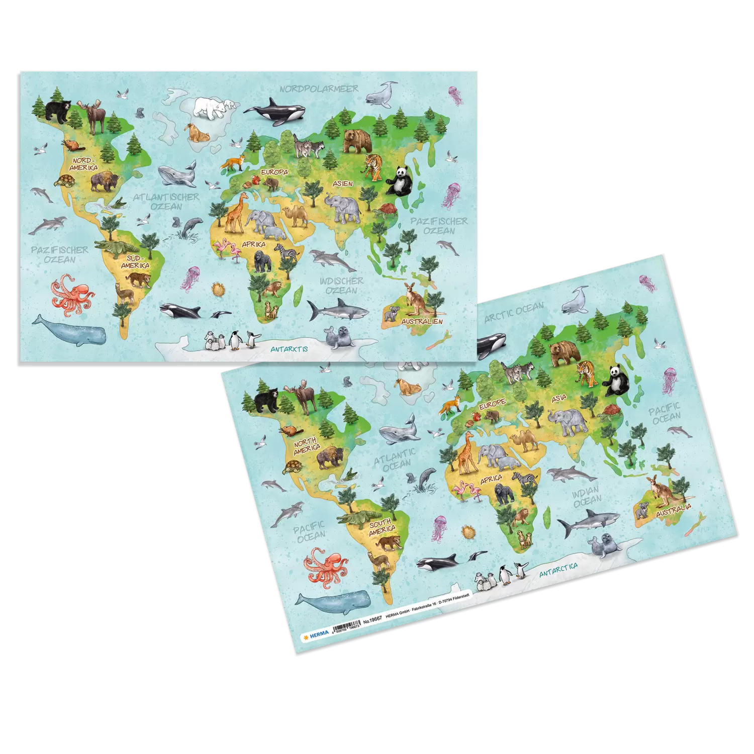 Multi-coloured cardboard desk pads by HERMA are ideal for children. The cheerful design of the world map shows them at a glance which animals are at home in which countries on earth, teaching the little ones their first basic knowledge of geography and animals in a playful way. The surface of the desk pad is non-slip and pleasantly soft, so your children will learn to write, paint and draw with ease. The colourful and attractively illustrated desk pad is suitable for both left-handed and right-handed users, as it has no high edge or other feature that could hinder writing. It not only looks super cute, it’s also easy to clean, because the surface is smooth and easy to wipe. Perfect protection for work surfaces from scratches or other damage that can quickly occur in everyday life. It can also be used on both sides – your child can simply turn the pad over and even learn the name in English. The desk pad is available in 550 x 350 mm format.