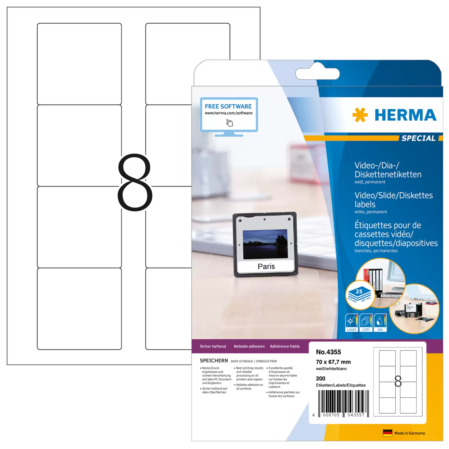 Labels for 3.5" diskettes and ZIP diskettes, on A4 sheets, self-adhesive. For well-organized data archives: ideal for labelling 3.5" diskettes and ZIP diskettes. Environmentally friendly: high-quality, chlorine-free bleached special paper, FSC™ Mix Credit certified, solvent-free adhesive. Excellent printing results on all laser printers, inkjet printers, copiers, colour laser printers and colour copiers. Trouble-free processing thanks to all-round protective edge and optimum flatness. Free software solutions: www.herma.com/software.