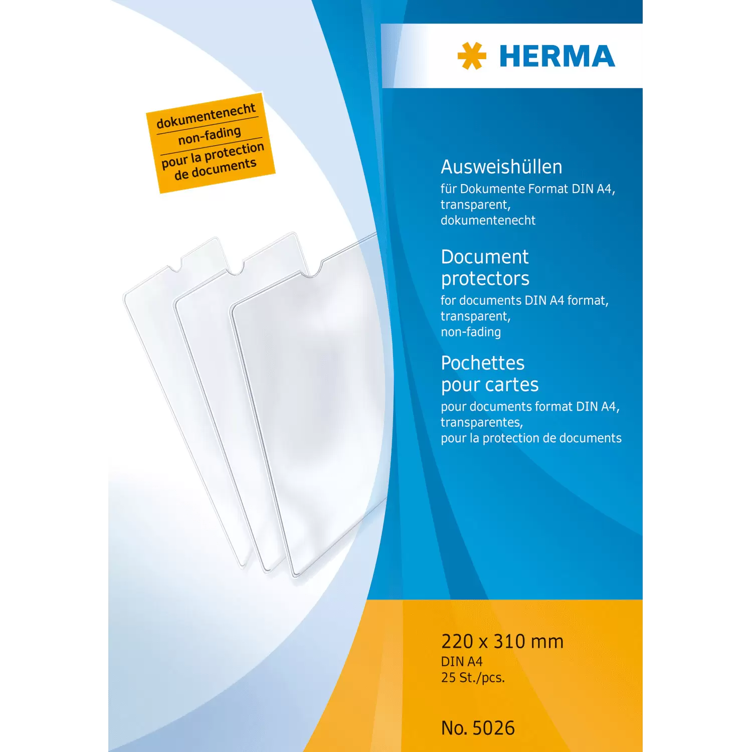 Documents, ID cards as well as bank, credit and other important cards should be well protected and safely stored. The HERMA insert sleeve made of transparent polypropylene film is ideal for documents and more in A4 (220 x 310 mm) format. The document cover is extremely hard-wearing and sturdy, document-proof, tear-resistant, odor-free and protects against moisture, dirt and wear, even when on the move in your wallet, purse or pocket. That is HERMA quality Made in Germany.