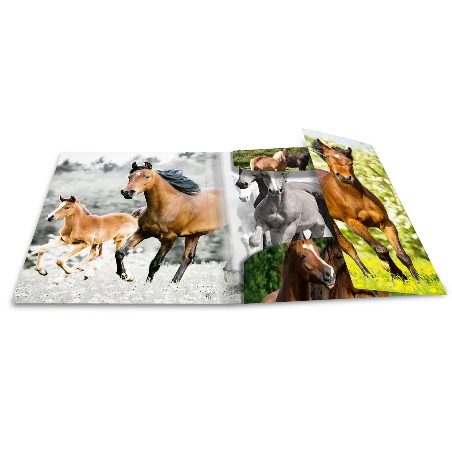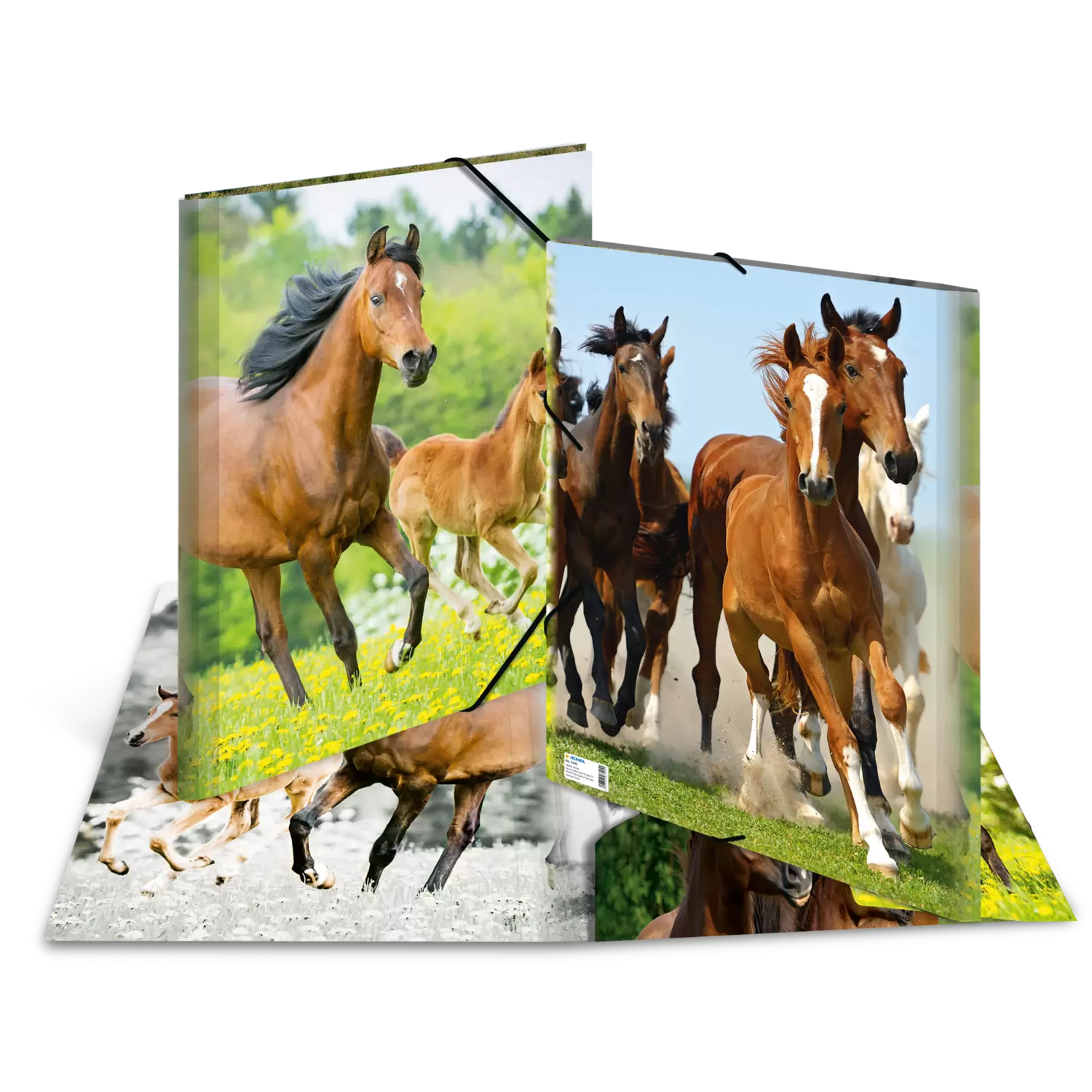 Elasticated folder with elastic straß and 3 printed flaps. Made of sturdy polypropylene, size A3. Ideal for storing loose papers. Available in design horses.