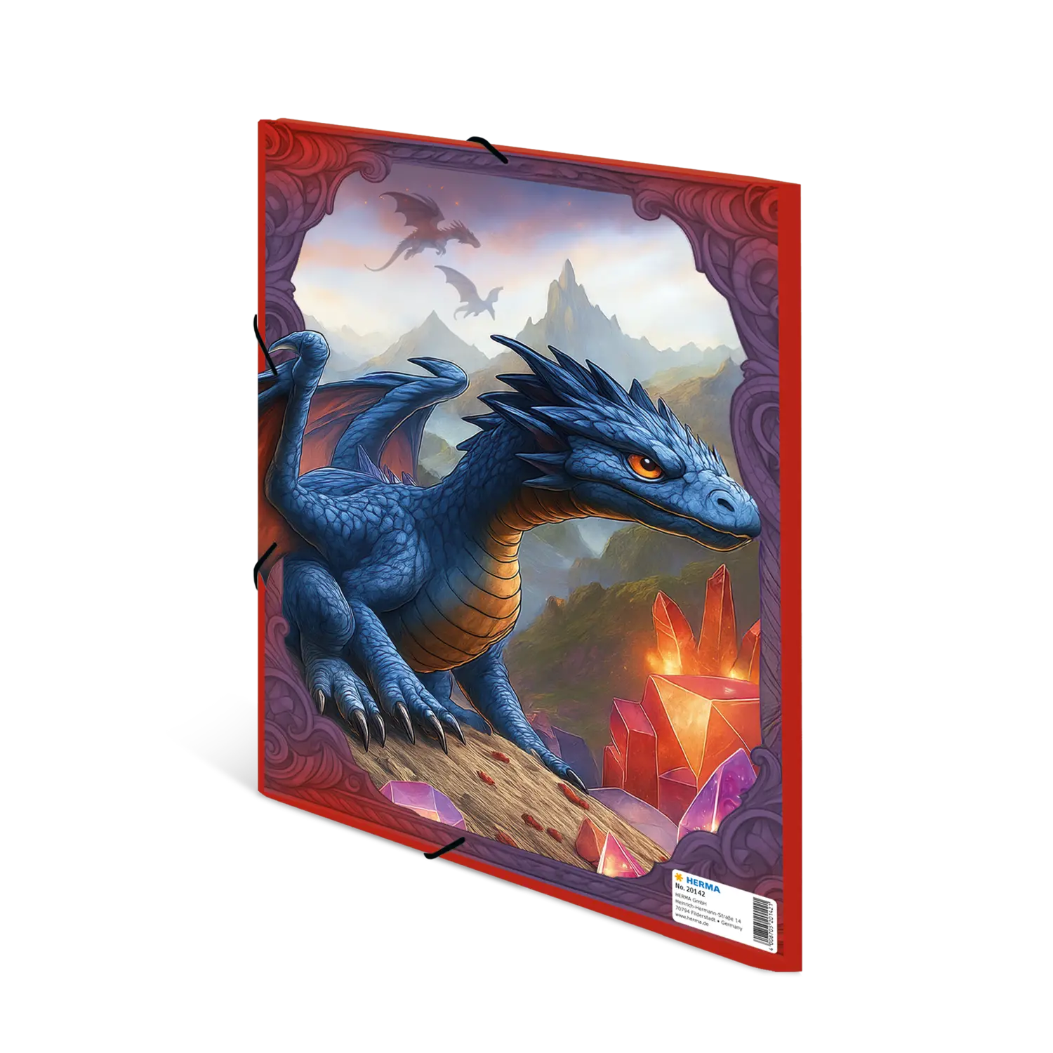 Things are heating up: the magical dragons are coming! The lovingly illustrated design shows these fantastic creatures in action: breathing fire, flying, and traveling with their loyal dragon riders. The perfect motif for imaginative dragon fans. Practical and robust. That's HERMA quality. The folder measures 32 cm x 24 cm, making it large enough for papers, drawings, and documents up to A4 size. It is made of sturdy cardboard and can be easily opened and closed with two high-quality corner fasteners. The practical table of contents for self-labeling ensures order and structure within the folder. The three interior flaps protect the contents and prevent even smaller documents from falling out.
