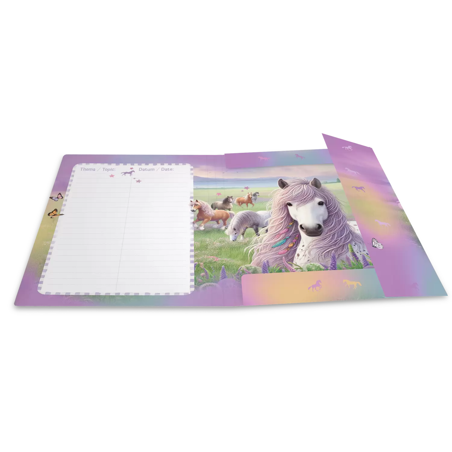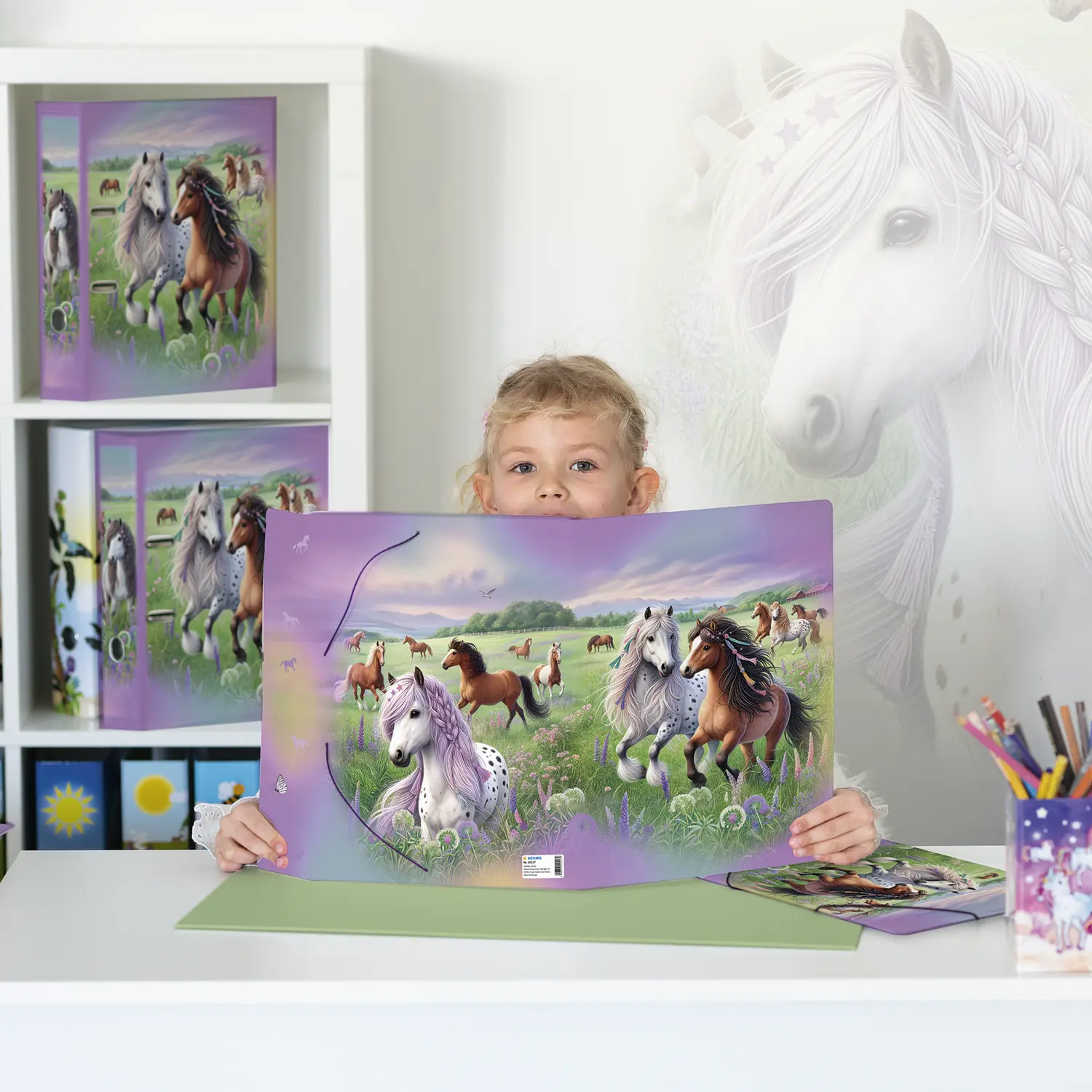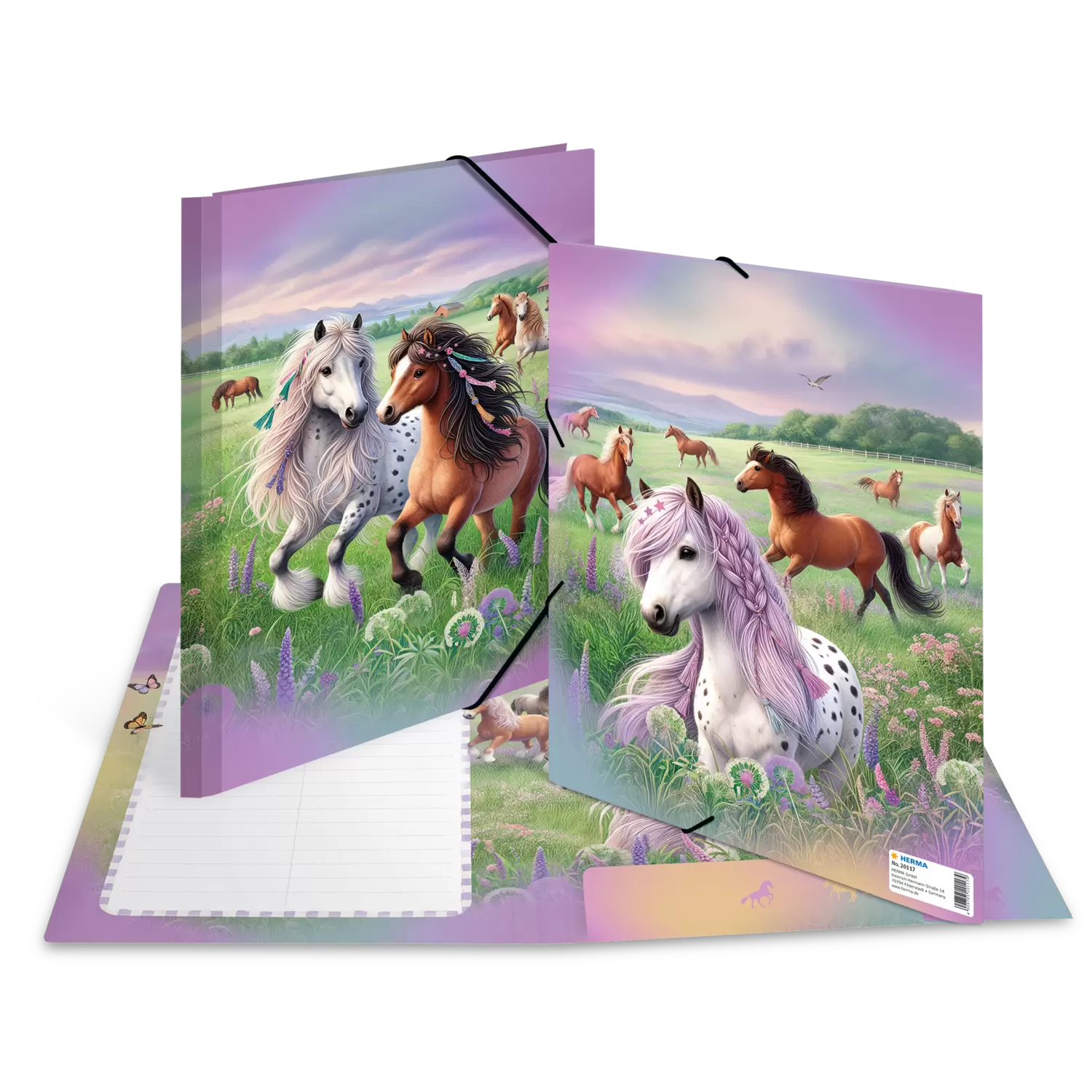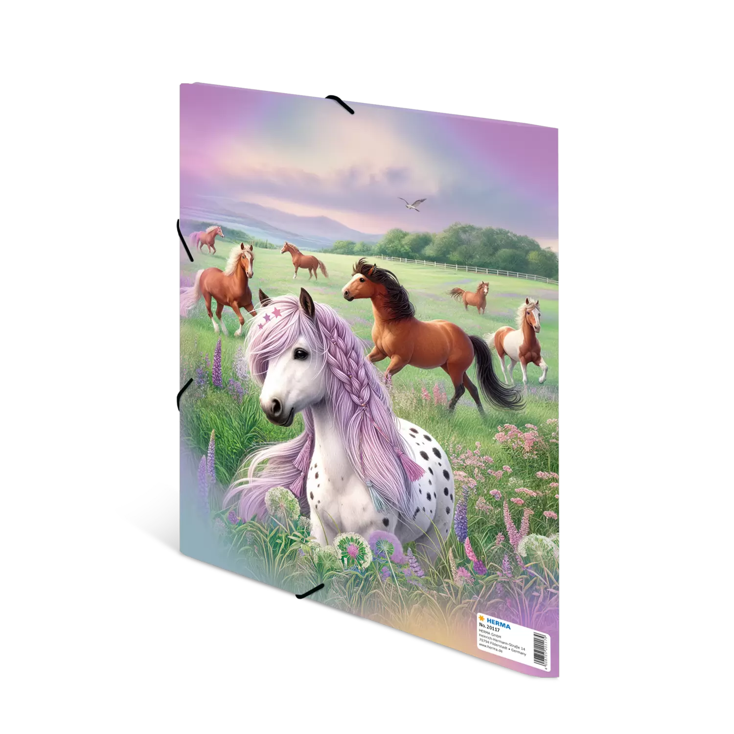 - Suitable for formats up to A4, made of sturdy cardboard, with elastic corner straps and 3 printed interior flaps