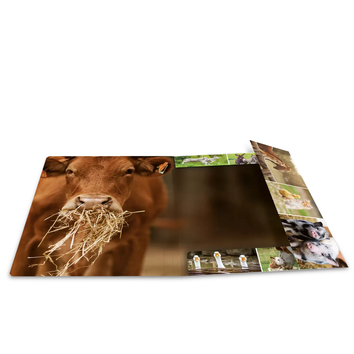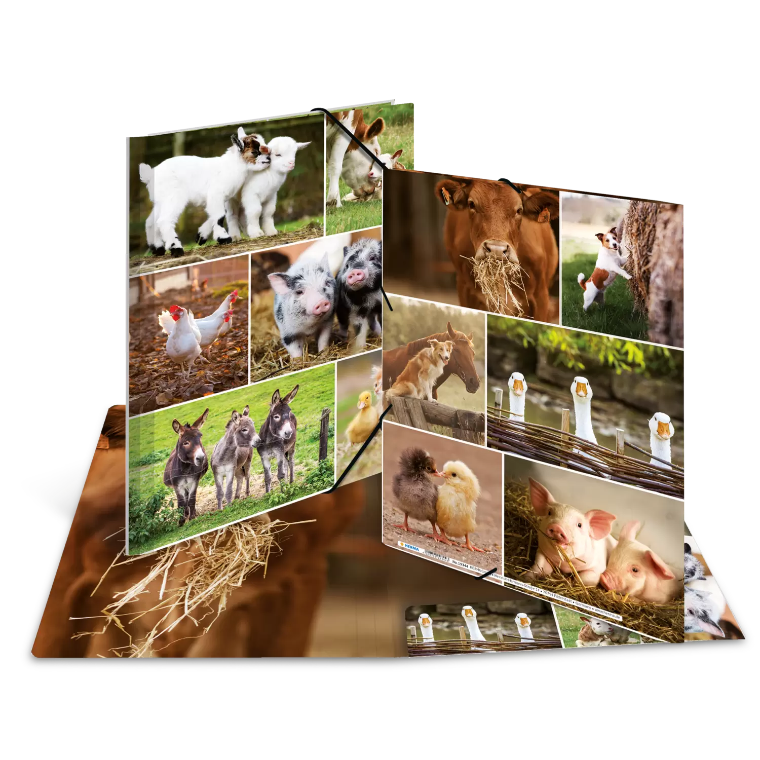 Watch out, farm fans! Anyone who loves the farm and its animals and likes to spend their time there , will have a great time with this folder, which is printed inside and outside with many different farm photographs. Ideal for all those who love to spend their time in the barn or on the pasture surrounded by cows, goats and chickens. The folder measures 32 cm x 24 cm and is therefore large enough for papers, drawings and documents up to A4 size. It is made of sturdy cardboard and can be easily opened and closed with two high-quality corner straps. The three interior flaps protect the contents and even smaller documents cannot fall out.