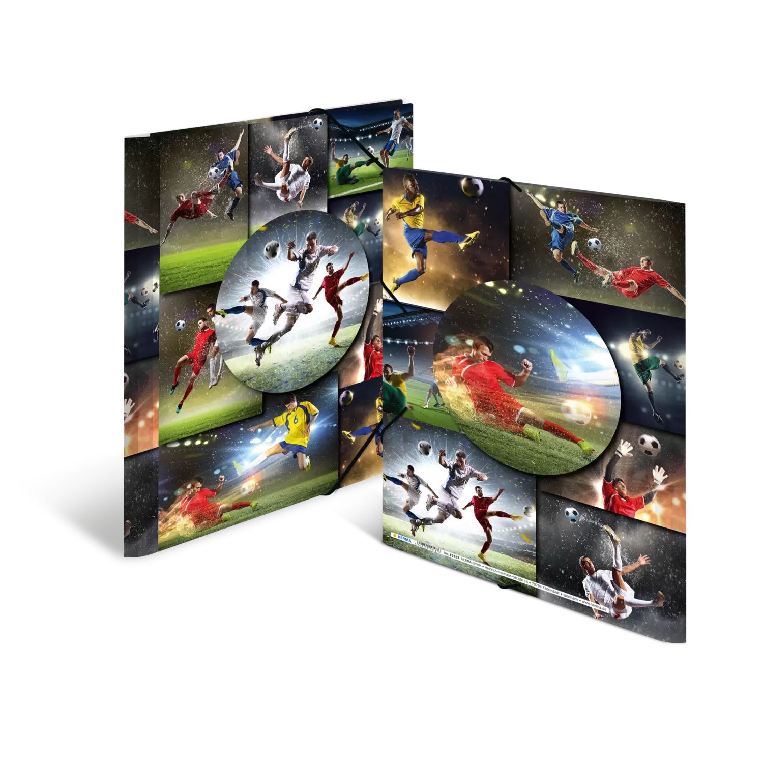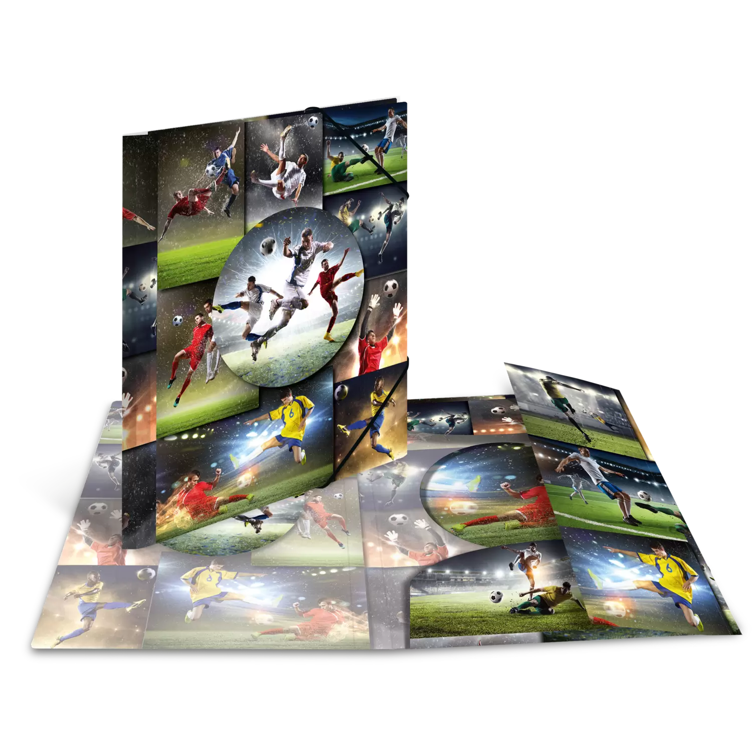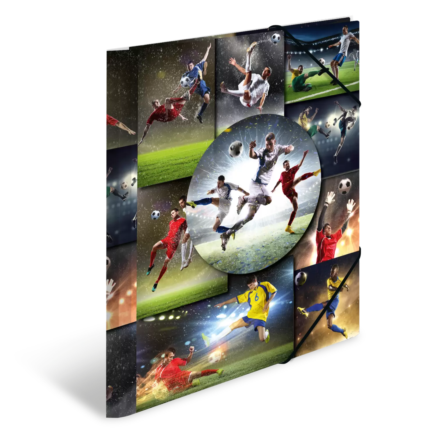The football design gives a dynamic accent to this folder with elastic strap and flaps. Made of sturdy polypropylene, size A4. Ideal for storing loose papers and pictures