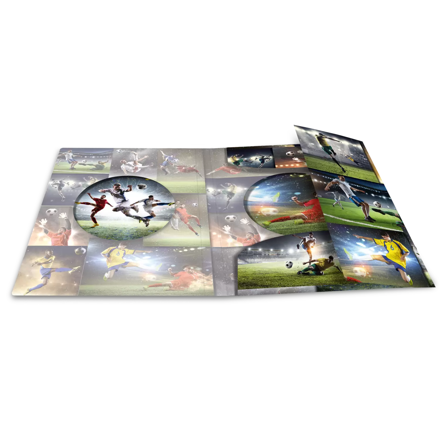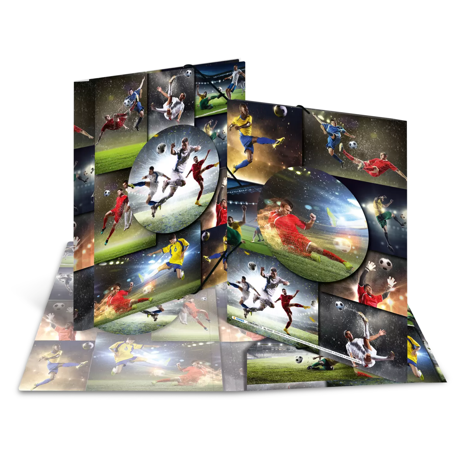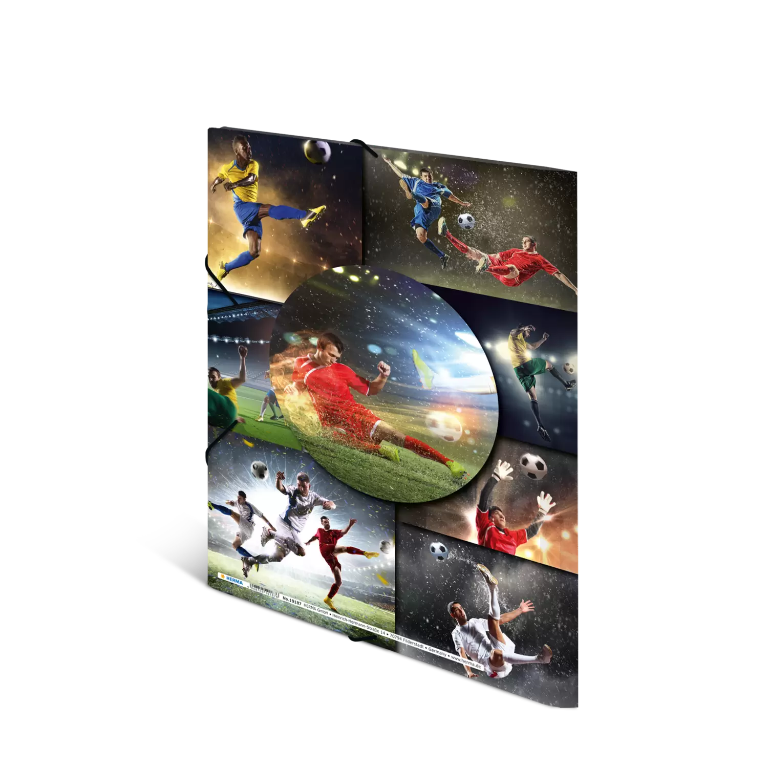 The football design gives a dynamic accent to this folder with elastic strap and flaps. Made of sturdy polypropylene, size A4. Ideal for storing loose papers and pictures