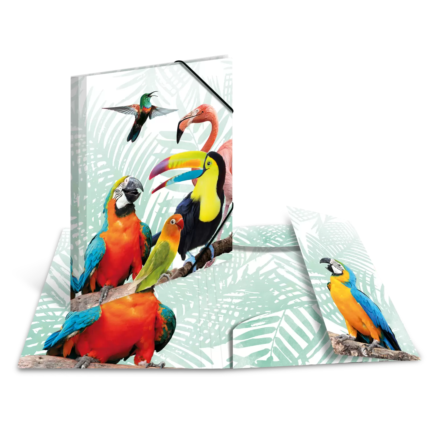 The animal motif folder Tropical Clique by HERMA, with coloured inner print, is ideal for all animal lovers who want to combine order and appearance. The folder has a plain background with fur pattern. The colourful, loudly and cheerfully chattering Tropical Clique spreads good mood and holiday feeling. Together with 4 other animal motifs, the folder belongs to the Exotic Animal series, which is guaranteed to put you in a good mood and offers everything that pupils and students need to store important documents and artworks easily and quickly. Equipped with high-quality corner straps, it holds the content together so that it cannot fall out and get lost. Papers are also optimally protected against dirt, grime and other external influences, as the HERMA elasticated folder has three integrated interior flaps. It is also extremely hard-wearing and wipeable. Made of sturdy polypropylene, the folder helps keeping things tidy and provides an overview of a wide range of documents. Thanks to its size, the folder can be easily transported home from work or school as it fits easily into a rucksack, school bag or briefcase. Further motifs of the series are the Giraffe Friends, the Koala Family, the Monkey Gang and the Meerkat Troop. It has a size of 320 mm x 240 mm, so that pictures, documents and drawings up to a size of A4 can be stored neatly. The special feature of the folders is the inner print with a motif matching the outside. For larger artworks and documents, the assortment is also available in A3 format with the same motifs.