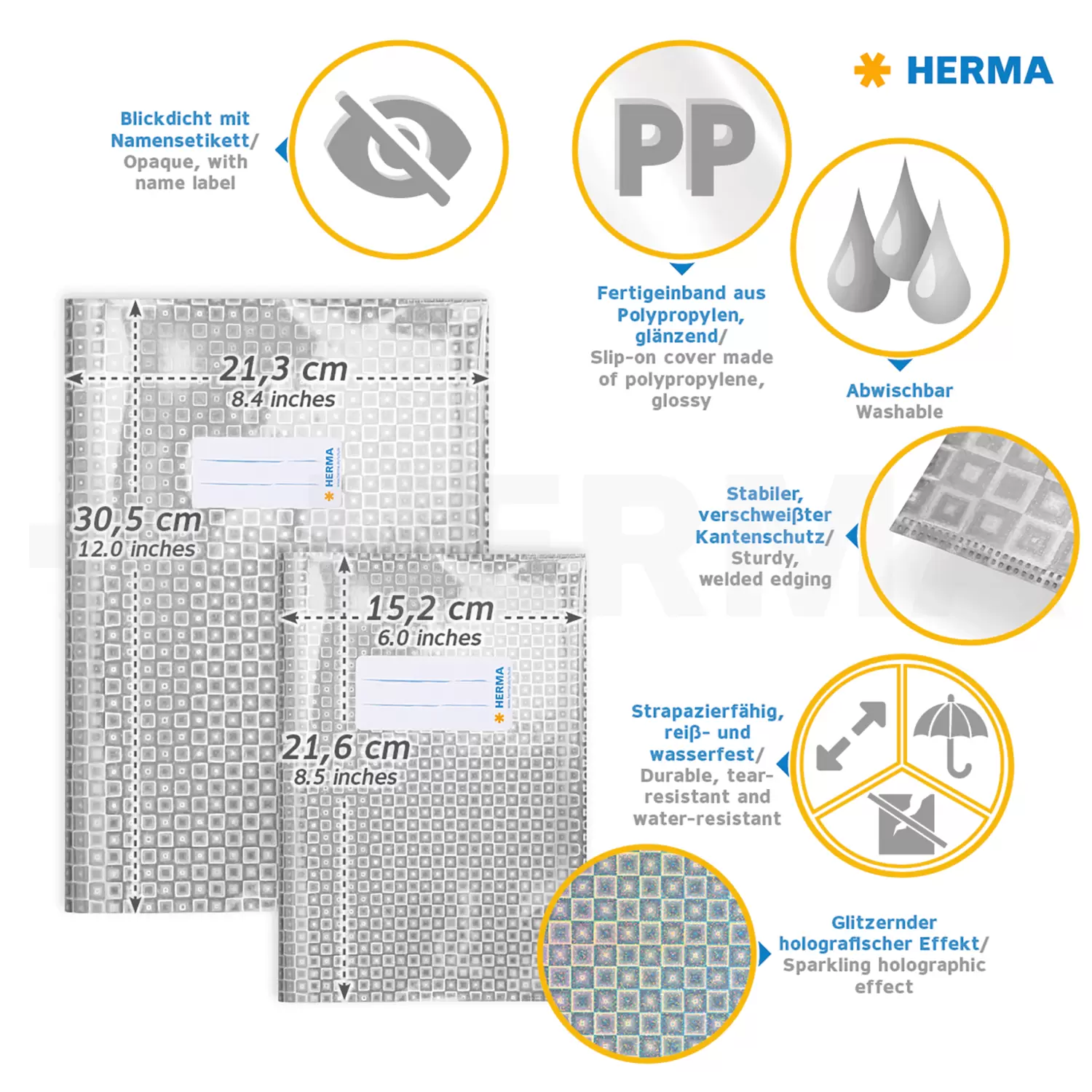 This sparkling A5 exercise book cover from HERMA is a real eye-catcher. It is made of conspicuous, silvery holographic film with a very special property: If light shines on the cover, it shimmers in all the colours of the rainbow, creating a magic effect. The tiny printed pattern comes to life. Besides having a striking design, this exercise book cover from HERMA is also practical. It is made of rugged polypropylene, which provides long-lasting protection against dirt, dust and wear for size A5 documents, copybooks and arithmetic books. No need to worry about annoying dog ears at the corners, your exercise books will stay like new for much longer. There is also an inscription label on the front for showing important information like the owner’s name, school or form level – ideal for staying well organised while adding a little magic to everyday life.