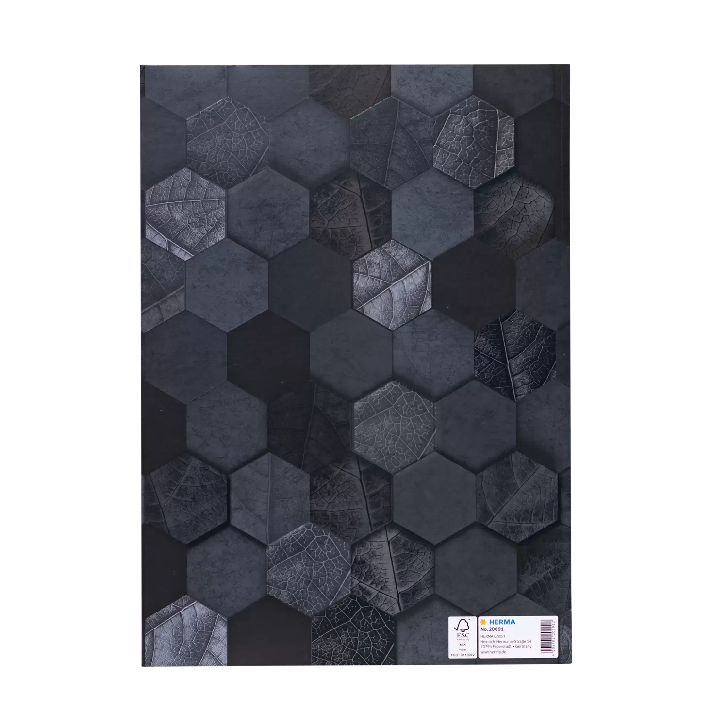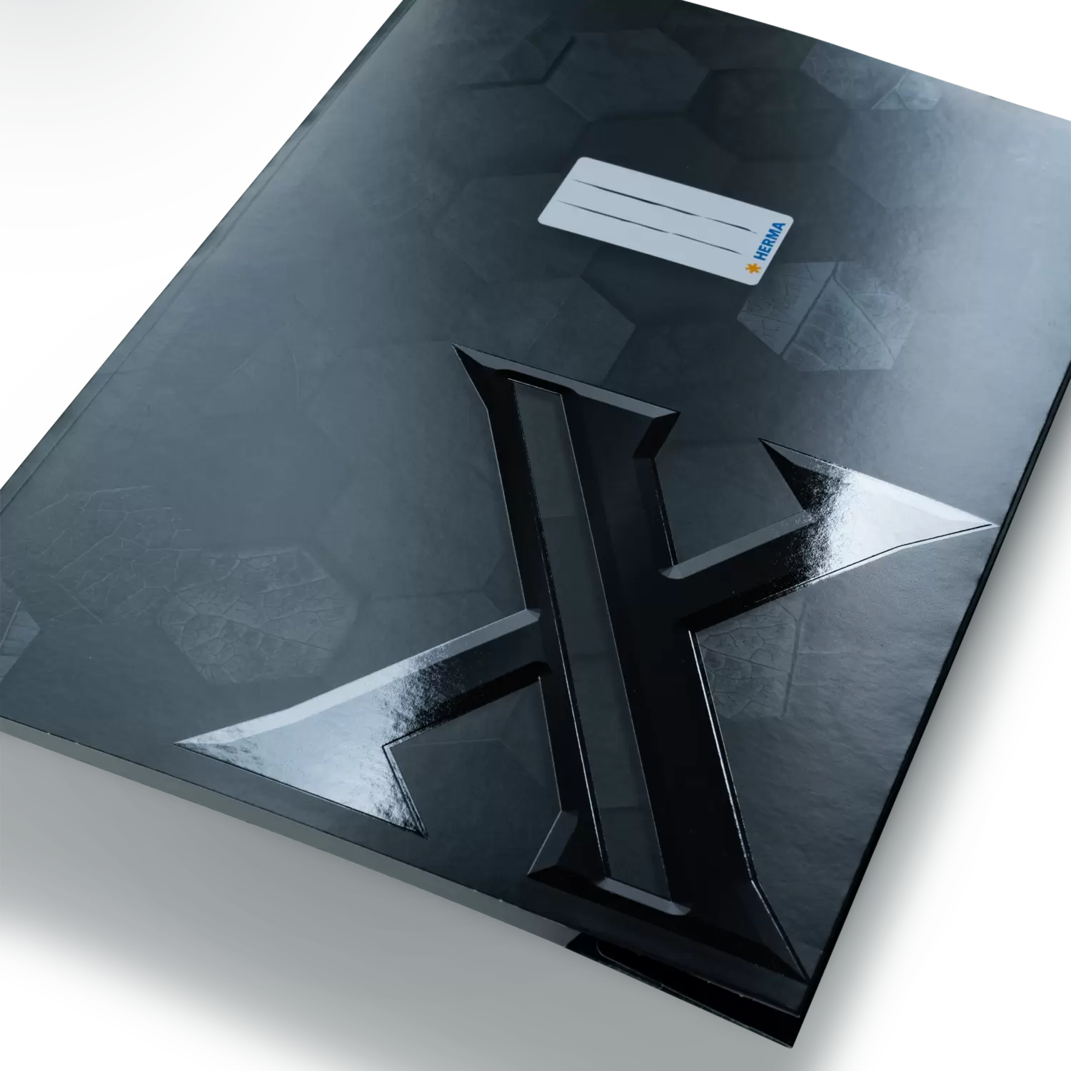 The HERMA exercise book cover X made of sturdy cardboard, is unique and mysterious. Does the bright, refined X on the front stand for the mathematics variable, as a code for a secret, for the creative element or as an unknown for the contents of the notebook which is protected? The exercise book cover Series X is not just a simple protective cover, but a gateway to a world of adventure and mystery, mystical and diverse. This black exercise book cover X is in A4 format and is decorated with artful hexagons, these are filled with fine leaf structures that create a fascinating organic structure. Looking at the cool design with the bright, refined X triggers creativity and brings easily thoughts on paper. Whether at school, while studying or during leisure time - this exercise book cover is the perfect companion for all those who are looking for something special: The new X series.