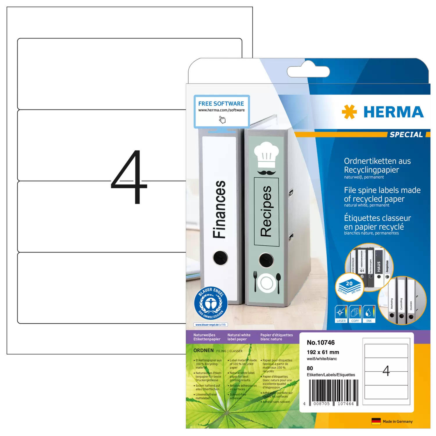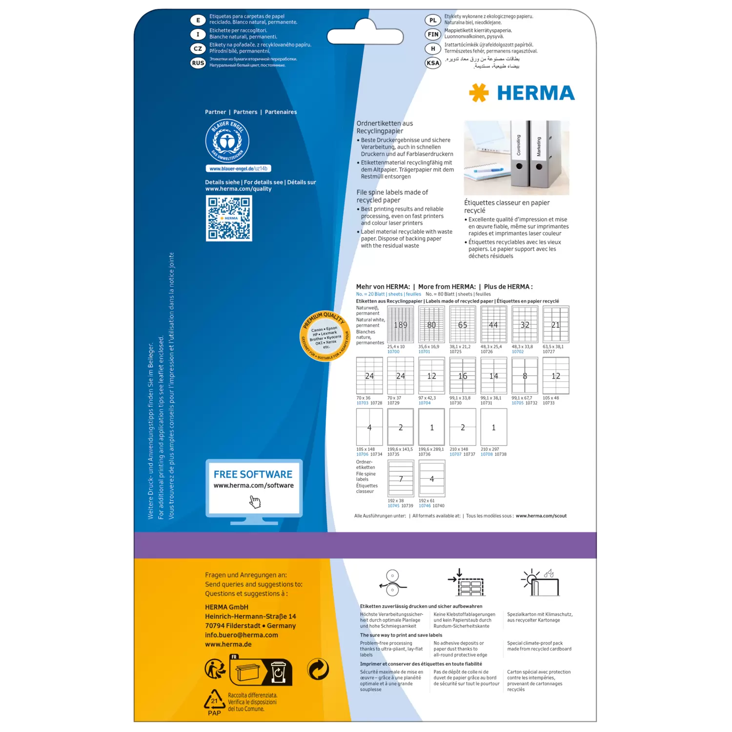 Self-adhesive labels made of natural white recycled paper, on A4 sheets. Awarded the Blue Angel ecolabel. Ideal for addressing and labelling. Label paper made exclusively from 100% recycled paper. High whiteness (ISO 97/CIE 133), no chlorine bleaches. Water-based, solvent-free adhesive, plasticizer-free and acid-free, safe to use with all foods. Labels are 100% recyclable, dispose of as for waste paper. Packaging made from recycled cardboard. Trouble-free processing thanks to all-round protective edge and optimum flatness. Excellent printing results on all laser printers, inkjet printers, copiers, colour laser printers and colour copiers. Free software solutions: www.herma.com/software.