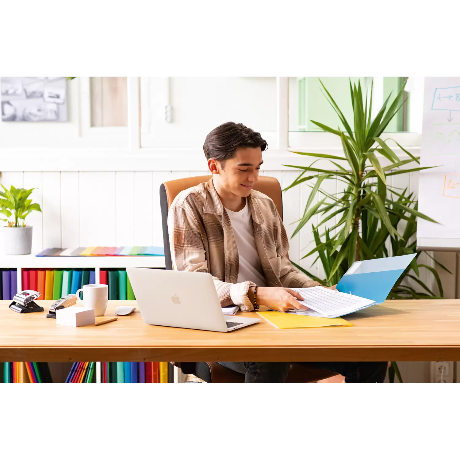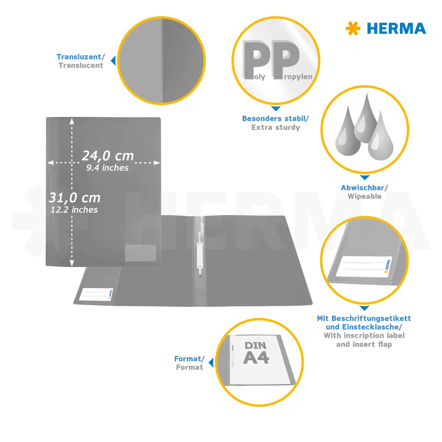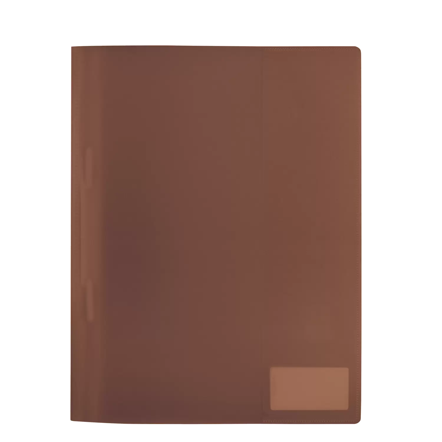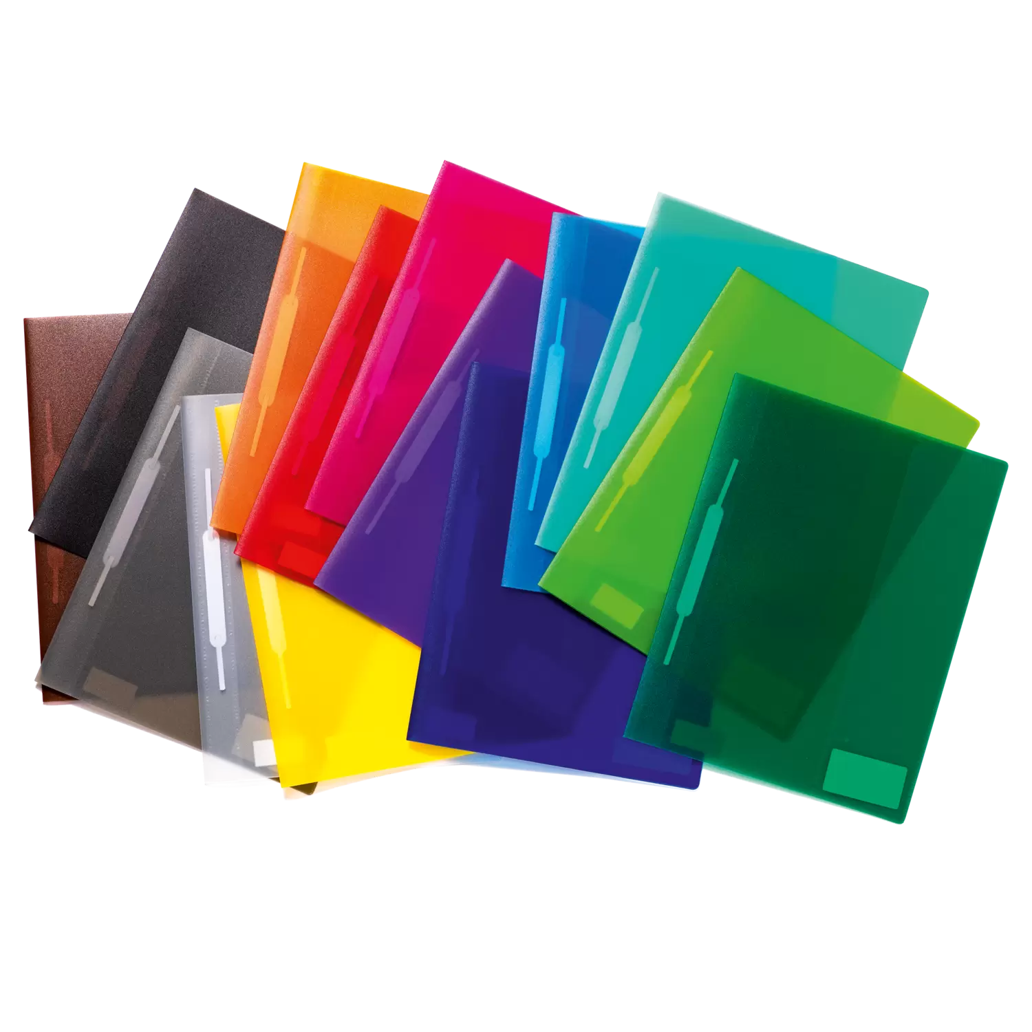 - Flat files for A4 sheets, made of strong, translucent, environmentally friendly polypropylene film with metal fastening clip, in 14 colours, with inscription label and interior pocket