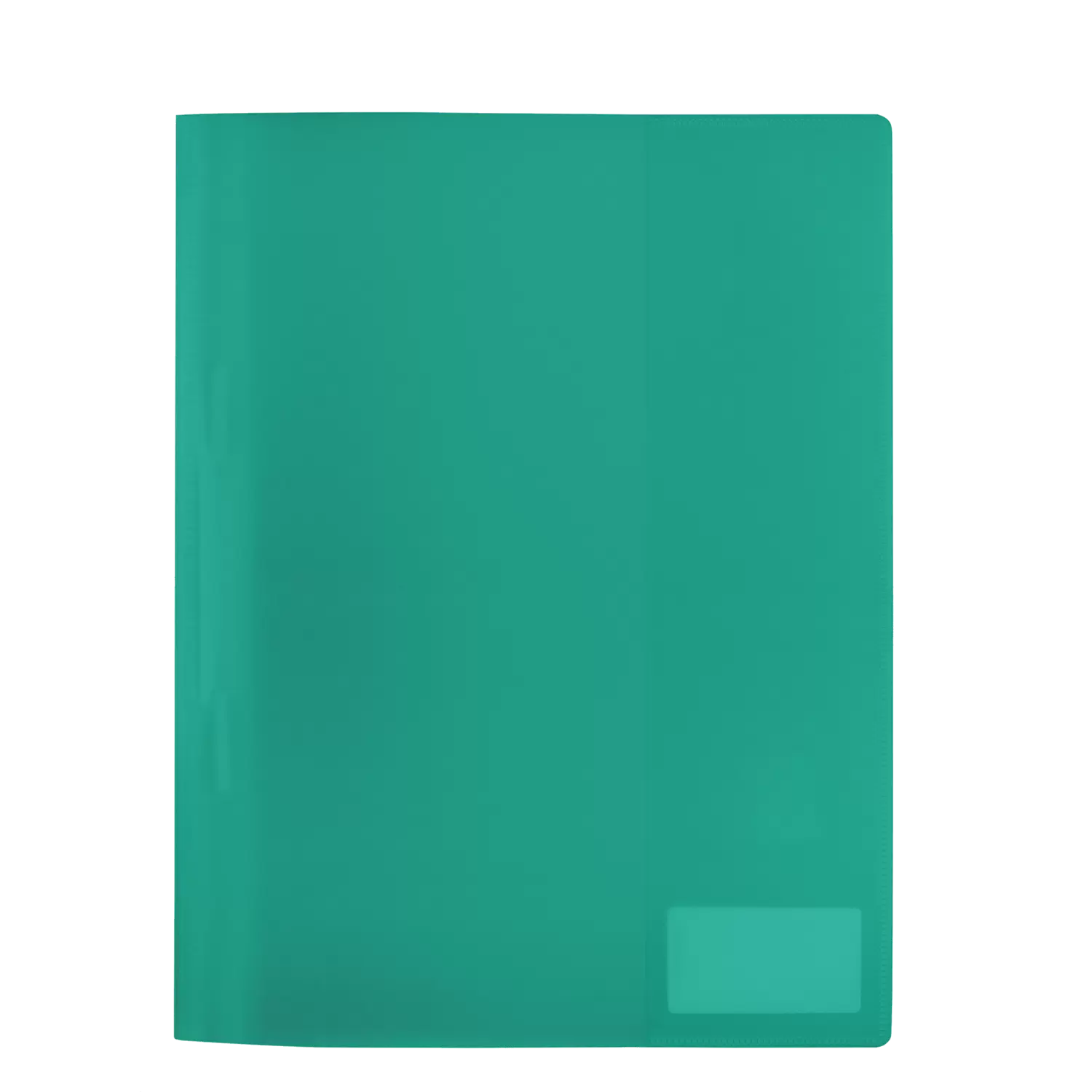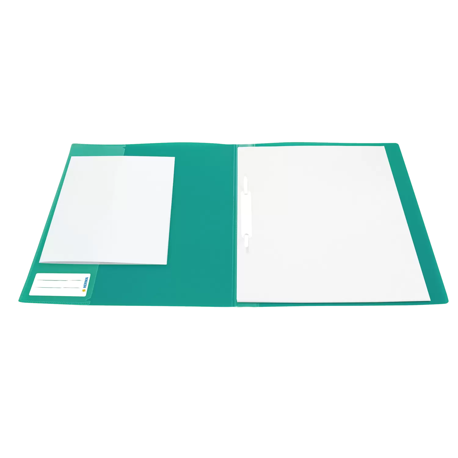 - Flat files for A4 sheets, made of strong, translucent, environmentally friendly polypropylene film with metal fastening clip, in 14 colours, with inscription label and interior pocket