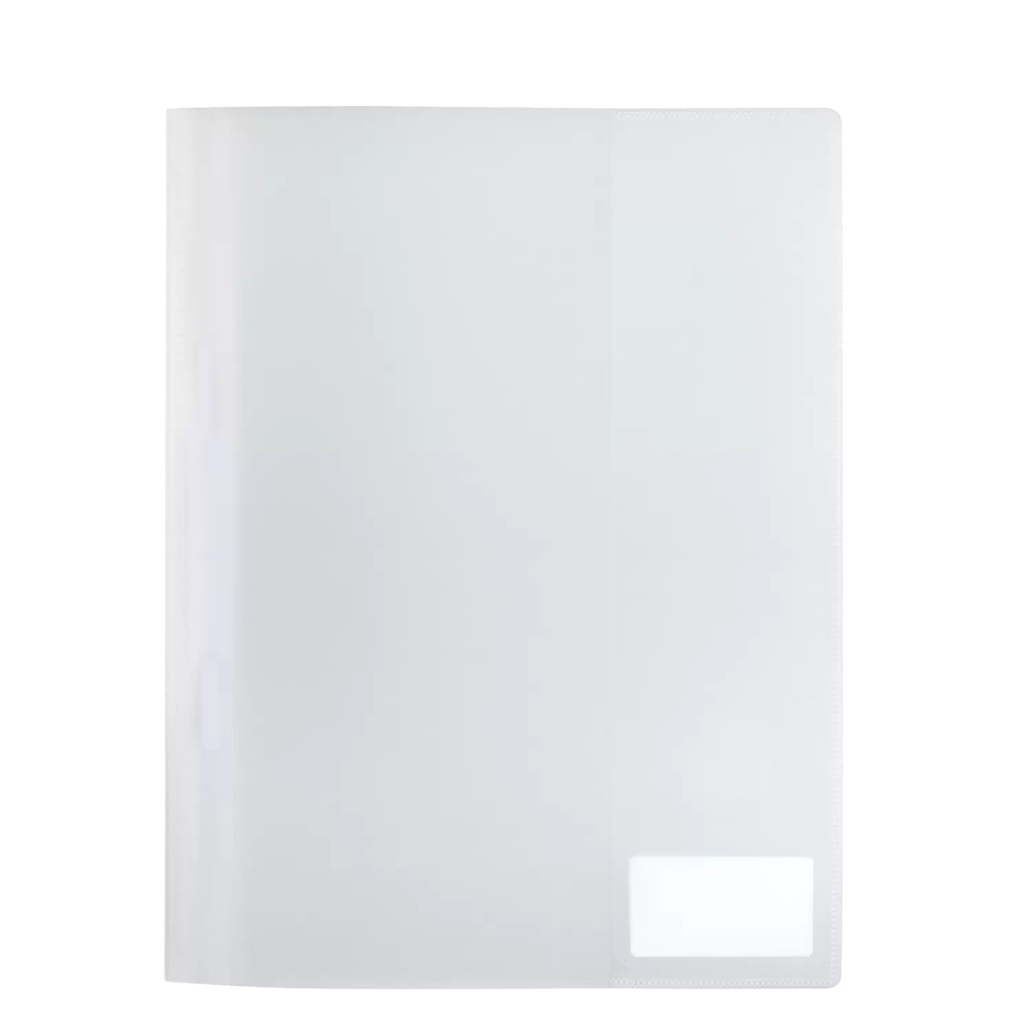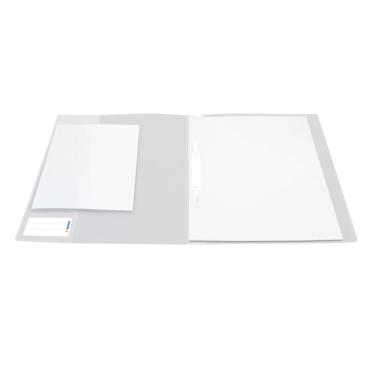- Flat files for A4 sheets, made of strong, translucent, environmentally friendly polypropylene film with metal fastening clip, in 14 colours, with inscription label and interior pocket