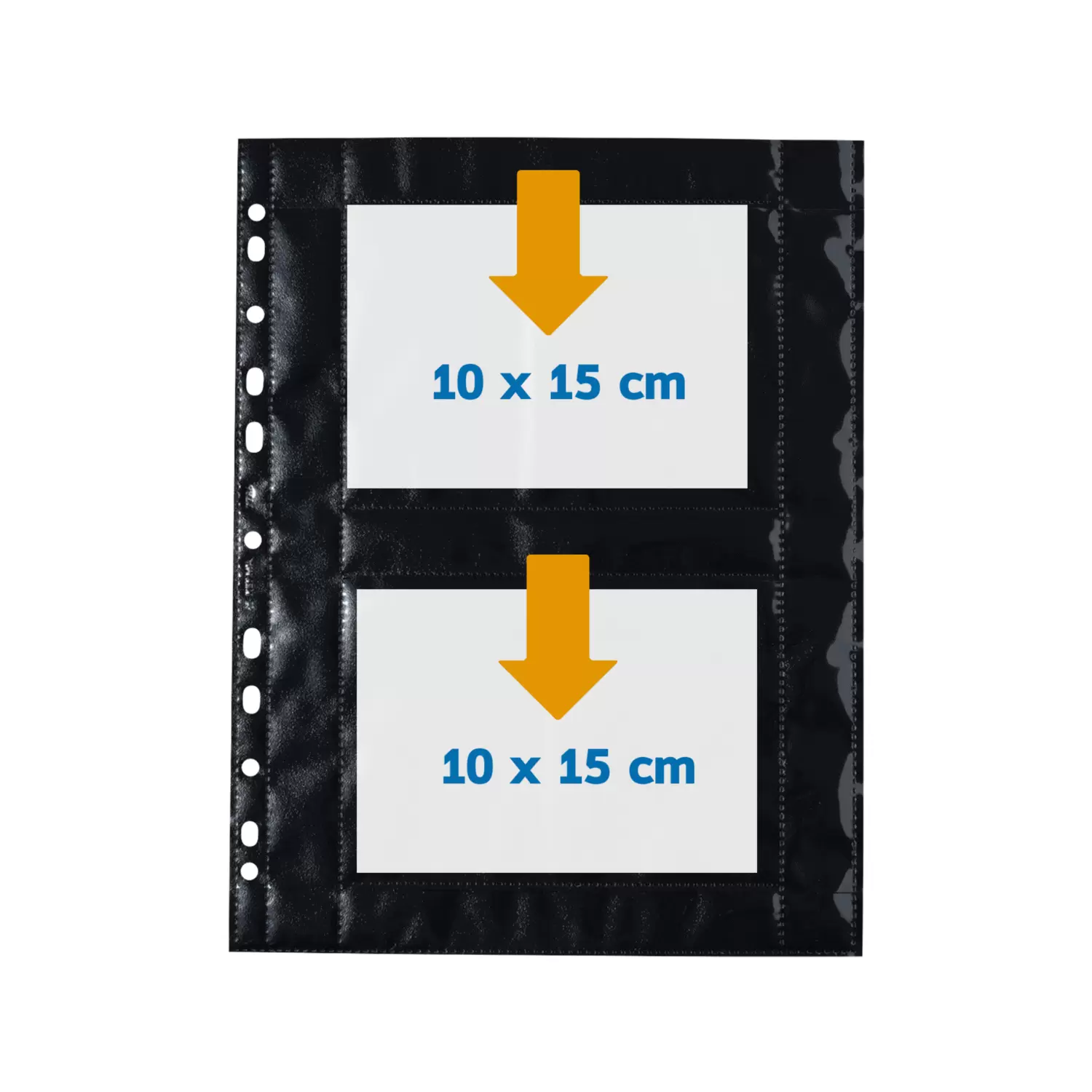 HERMA Fotophan photo pockets are practical organizer and storage aids for photos, pictures, postcards, tickets and much more. Simply insert them into the transparent pockets and everything is safely stowed away - uncomplicated and completely without any sticking! The photo pockets are made of sturdy black polypropylene, with clear-transparent pockets welded on both sides for photos up to 10 x 15 cm in landscape format. This way, 4 photos per pocket can be stored safely and securely. The pockets are absolutely plasticizer-free and archival safe, with no chemical effects on the photos. Thanks to the practical Euro perforation, they can be filed into all standard files, albums and ring binders for A4 formats. Ideal are the HERMA Fotobooks, which are available in 5 great colours. Perfect protection, completely without dirt, creases or fingerprints.