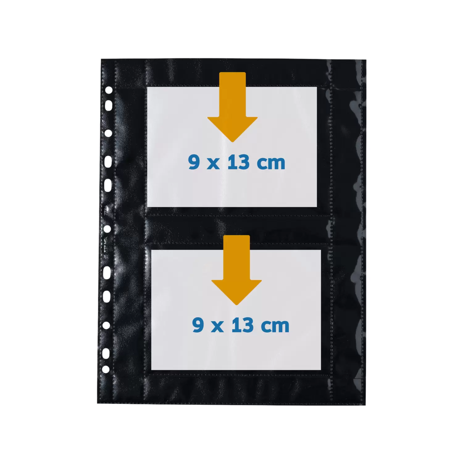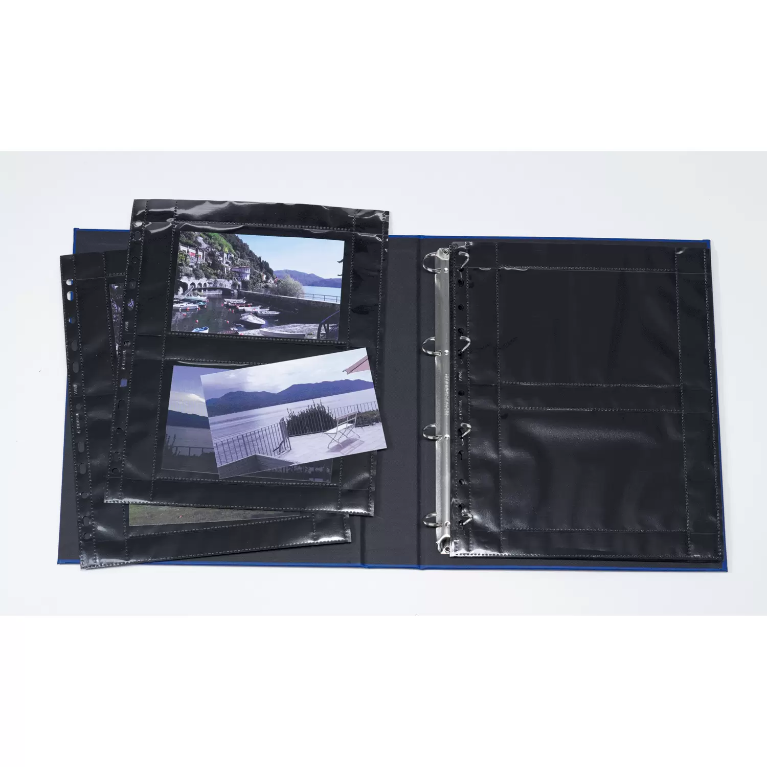 HERMA Fotophan photo pockets are practical organizer and storage aids for photos, pictures, postcards, tickets and much more. Simply insert them into the transparent pockets and everything is safely stowed away - uncomplicated and completely without any sticking! The photo pockets are made of sturdy black polypropylene, with clear-transparent pockets welded on both sides for photos up to 10 x 15 cm in landscape format. This way, 4 photos per pocket can be stored safely and securely. The pockets are absolutely plasticizer-free and archival safe, with no chemical effects on the photos. Each package contains 10 pockets with space for 40 photos. Thanks to the practical Euro perforation, they can be filed into all standard files, albums and ring binders for A4 formats. Ideal are the HERMA Fotobooks, which are available in 5 great colours. Perfect protection, completely without dirt, creases or fingerprints.