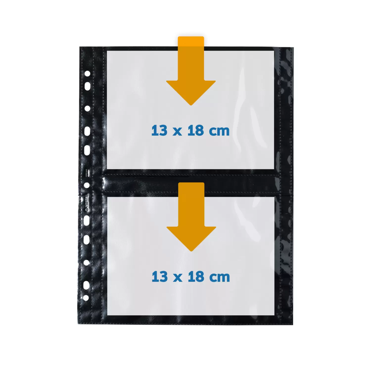 HERMA Fotophan photo pockets are practical organizer and storage aids for photos, pictures, postcards, tickets and much more. Simply insert them into the transparent pockets and everything is safely stowed away - uncomplicated and completely without any sticking! The photo pockets are made of sturdy black polypropylene, with clear-transparent pockets welded on both sides for photos up to 13 x 18 cm in landscape format. This way, 4 photos per pocket can be stored safely and securely. The pockets are absolutely plasticizer-free and archival safe, with no chemical effects on the photos. Thanks to the practical Euro perforation, they can be filed into all standard files, albums and ring binders for A4 formats. Ideal are the HERMA Fotobooks, which are available in 5 great colours. Perfect protection, completely without dirt, creases or fingerprints.