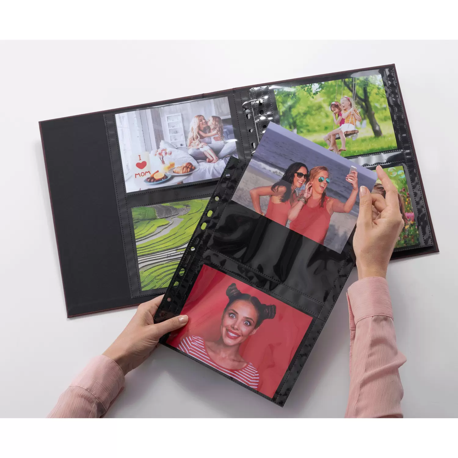 HERMA Fotophan photo pockets are practical organizer and storage aids for photos, pictures, postcards, tickets and much more. Simply insert them into the transparent pockets and everything is safely stowed away - uncomplicated and completely without any sticking! The photo pockets are made of sturdy black polypropylene, with clear-transparent pockets welded on both sides for photos up to 13 x 18 cm in landscape format. This way, 4 photos per pocket can be stored safely and securely. The pockets are absolutely plasticizer-free and archival safe, with no chemical effects on the photos. Each package contains 10 pockets with space for 40 photos. Thanks to the practical Euro perforation, they can be filed into all standard files, albums and ring binders for A4 formats. Ideal are the HERMA Fotobooks, which are available in 5 great colours. Perfect protection, completely without dirt, creases or fingerprints.