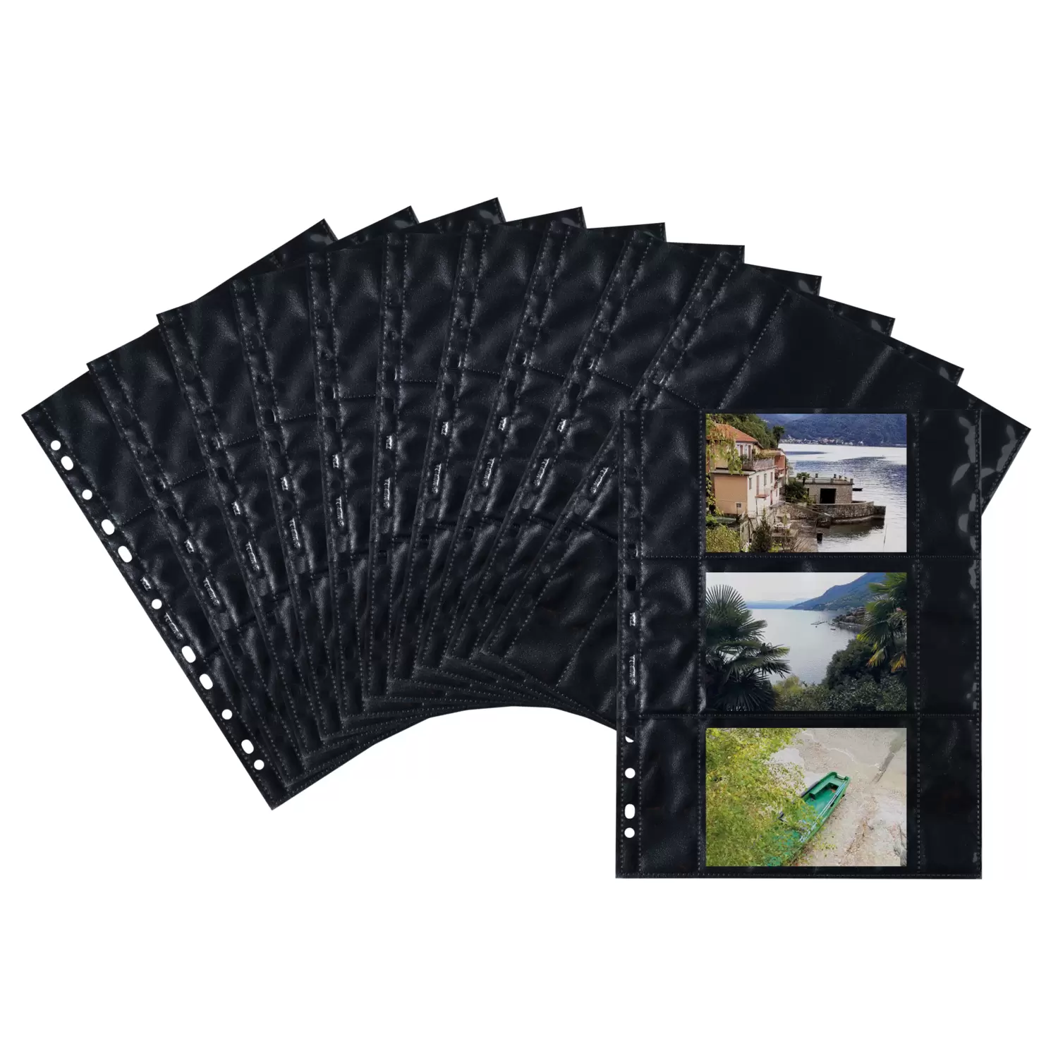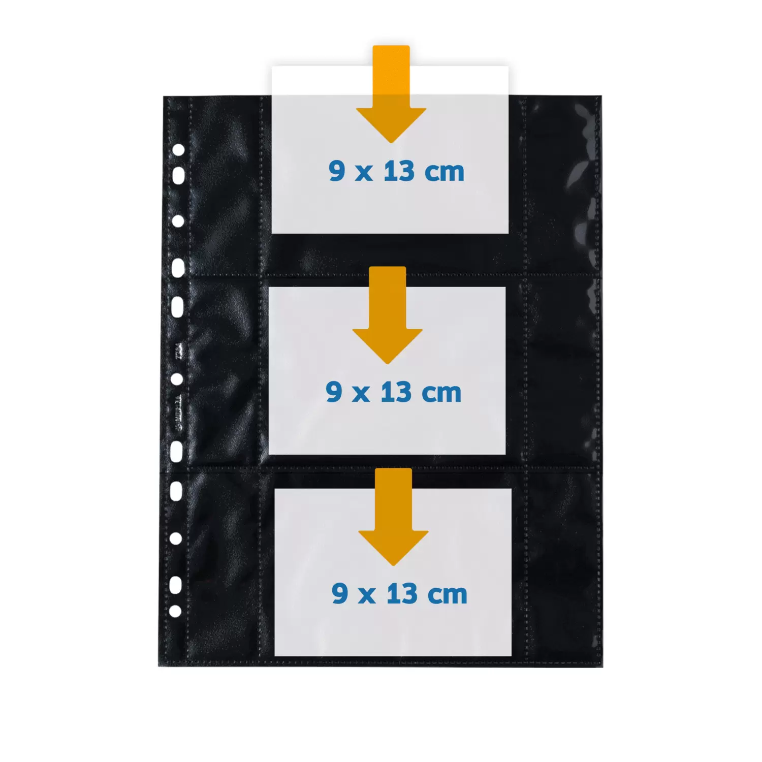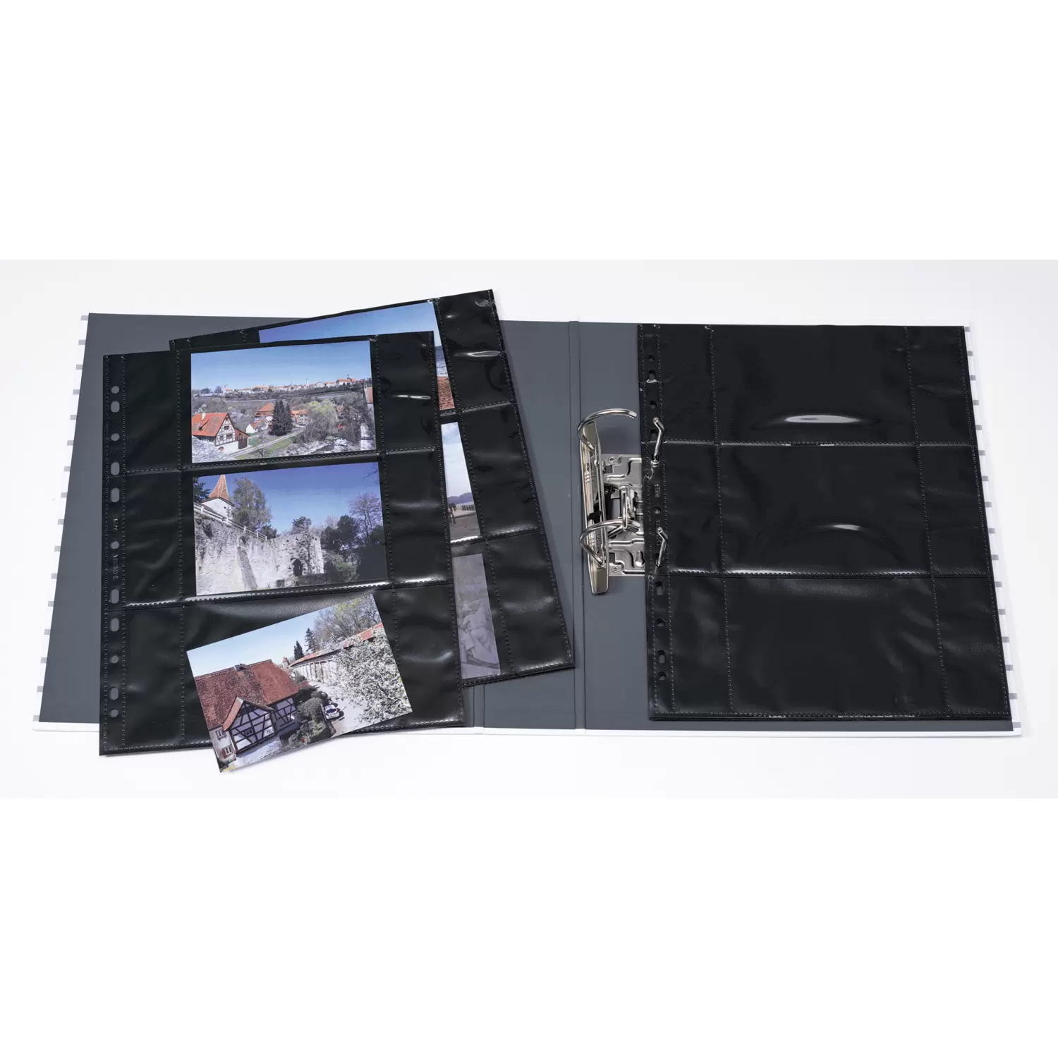 HERMA Fotophan photo pockets are practical organizer and storage aids for photos, pictures, postcards, tickets and much more. Simply insert them into the transparent pockets and everything is safely stowed away - uncomplicated and completely without any sticking! The photo pockets are made of sturdy black polypropylene, with clear-transparent pockets welded on both sides for photos up to 9 x 13 cm in landscape format. This way, 6 photos per pocket can be stored safely and securely. The pockets are absolutely plasticizer-free and archival safe, with no chemical effects on the photos. Each package contains 10 pockets with space for 60 photos. Thanks to the practical Euro perforation, they can be filed into all standard files, albums and ring binders for A4 formats. Ideal are the HERMA Fotobooks, which are available in 5 great colours. Perfect protection, completely without dirt, creases or fingerprints.