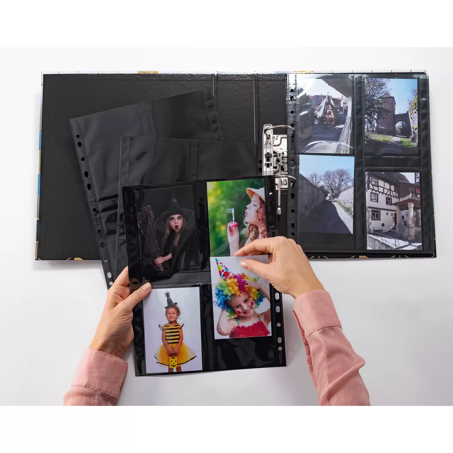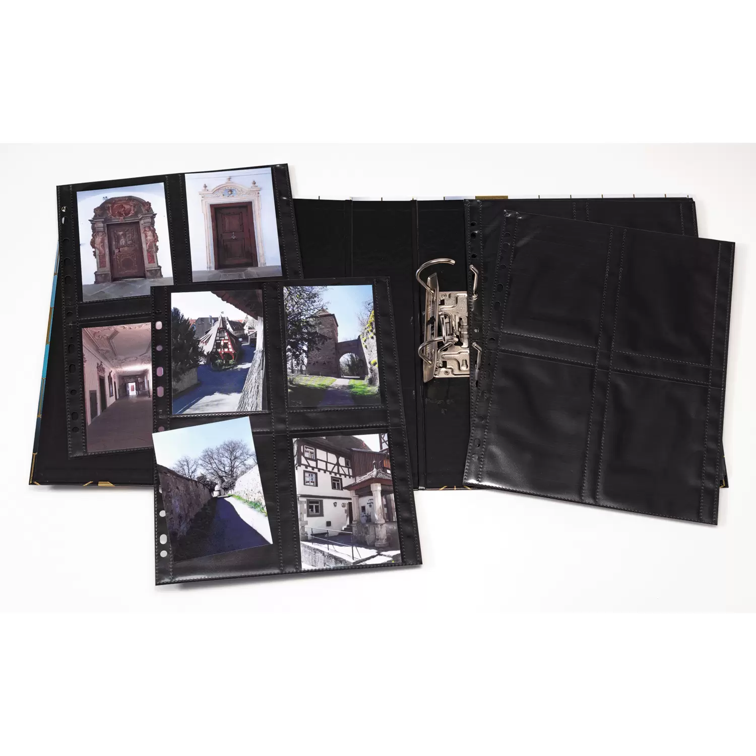 HERMA Fotophan photo pockets are practical organizer and storage aids for photos, pictures, postcards, tickets and much more. Simply insert them into the transparent pockets and everything is safely stowed away - uncomplicated and completely without any sticking! The photo pockets are made of sturdy black polypropylene, with clear-transparent pockets welded on both sides for photos up to 9 x 13 cm in portrait format. This way, 8 photos per pocket can be stored safely and securely. The pockets are absolutely plasticizer-free and archival safe, with no chemical effects on the photos. Each package contains 10 pockets with space for 80 photos. Thanks to the practical Euro perforation, they can be filed into all standard files, albums and ring binders for A4 formats. Ideal are the HERMA Fotobooks, which are available in 5 great colours. Perfect protection, completely without dirt, creases or fingerprints.