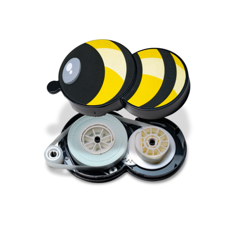1. Open the Glue Bee. 2. Remove the old roll and insert the new one. 3. Peel the leading edge from the roll and run it upwards past the roller and back to the ratchet wheel. 4. Wrap the end securely around the ratchet wheel.