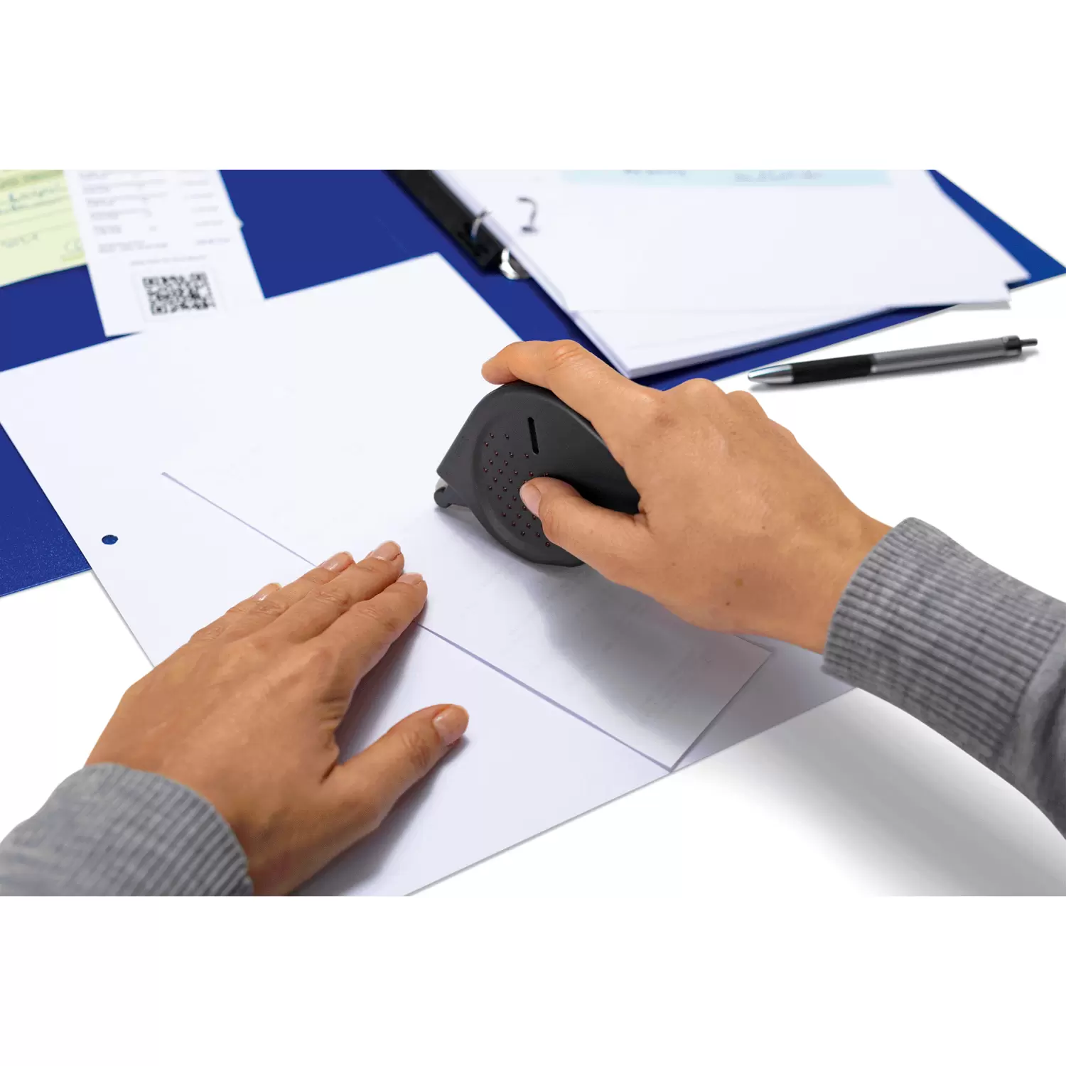 1. Open the glue dispenser. 2. Remove the old roll and insert the new one. 3. Peel the leading edge from the roll and run it upwards past the roller and back to the ratchet wheel. 4. Wrap the end of the strip securely around the ratchet wheel.