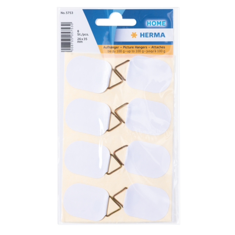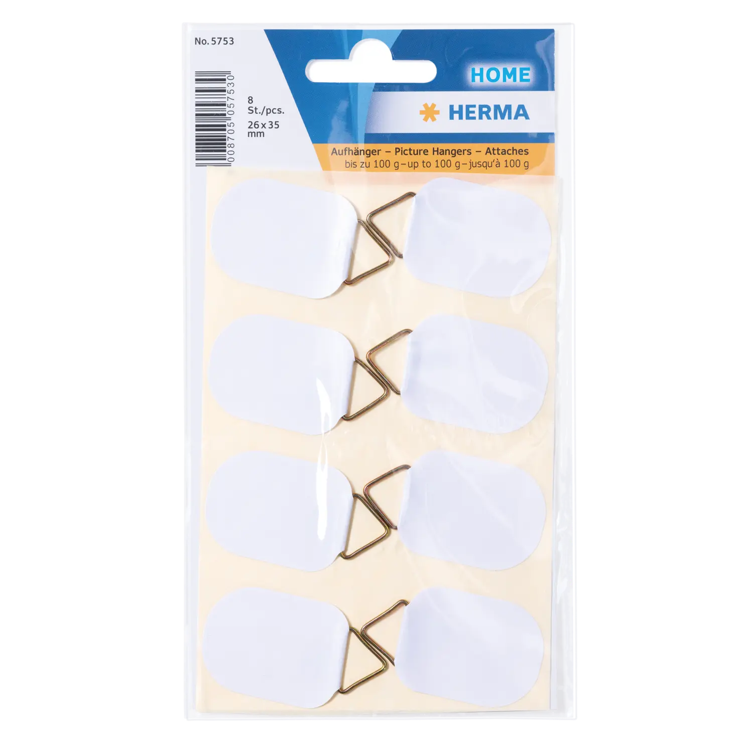 Self-adhesive, white hangers from HERMA made of paper with integrated wire hook for mounting postcards, pictures, posters and much more. 8 pieces per pack.The hangers have a size of 26 x 35 mm and hold up to 100 g. Simply peel it off the backing paper, stick it on and hang the object. An easy and cheap way to hang or reposition decorative objects and brighten up your home or office. Adheres to smooth surfaces such as wood, cardboard, plastics, glass, porcelain, ceramics and more. Caution: Reduced load capacity on curved surfaces. Does not adhere to hard or soft foam board or laminated surfaces.