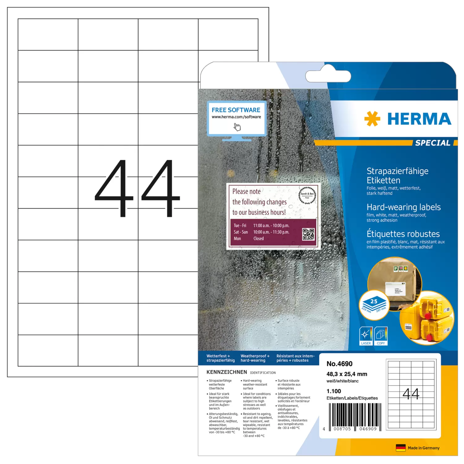 Weatherproof film labels A4, 48,3 x 25,4 mm, white, extremely strong adhesion