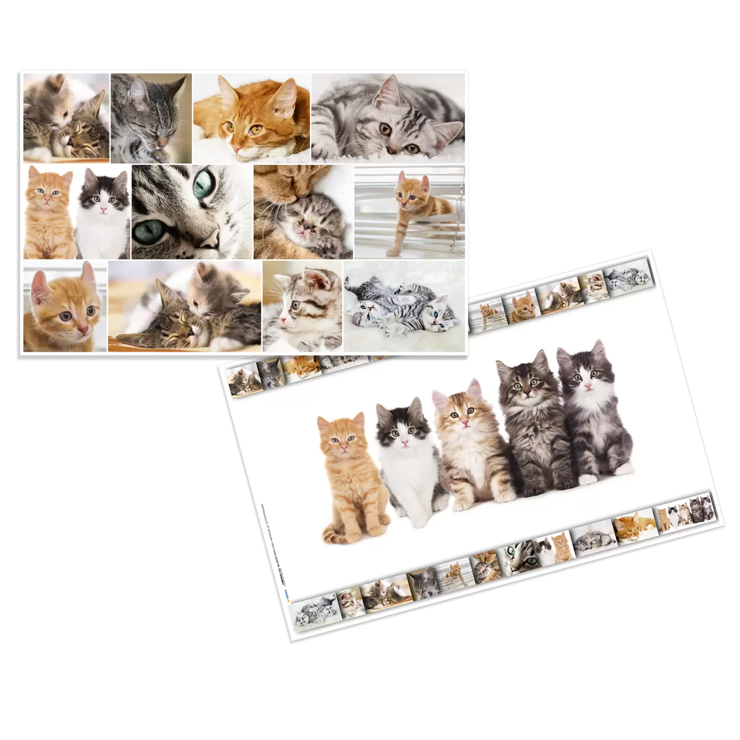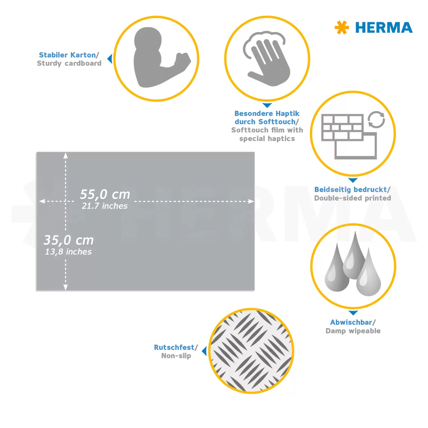Brand new: Colourful non-slip desk pads with a Softtouch surface. Made of sturdy coated cardboard, printed on both sides, size 550 x 350 mm, with four different designs. And when they’re no longer needed for homework, they provide an ideal surface for handicrafts and drawing.