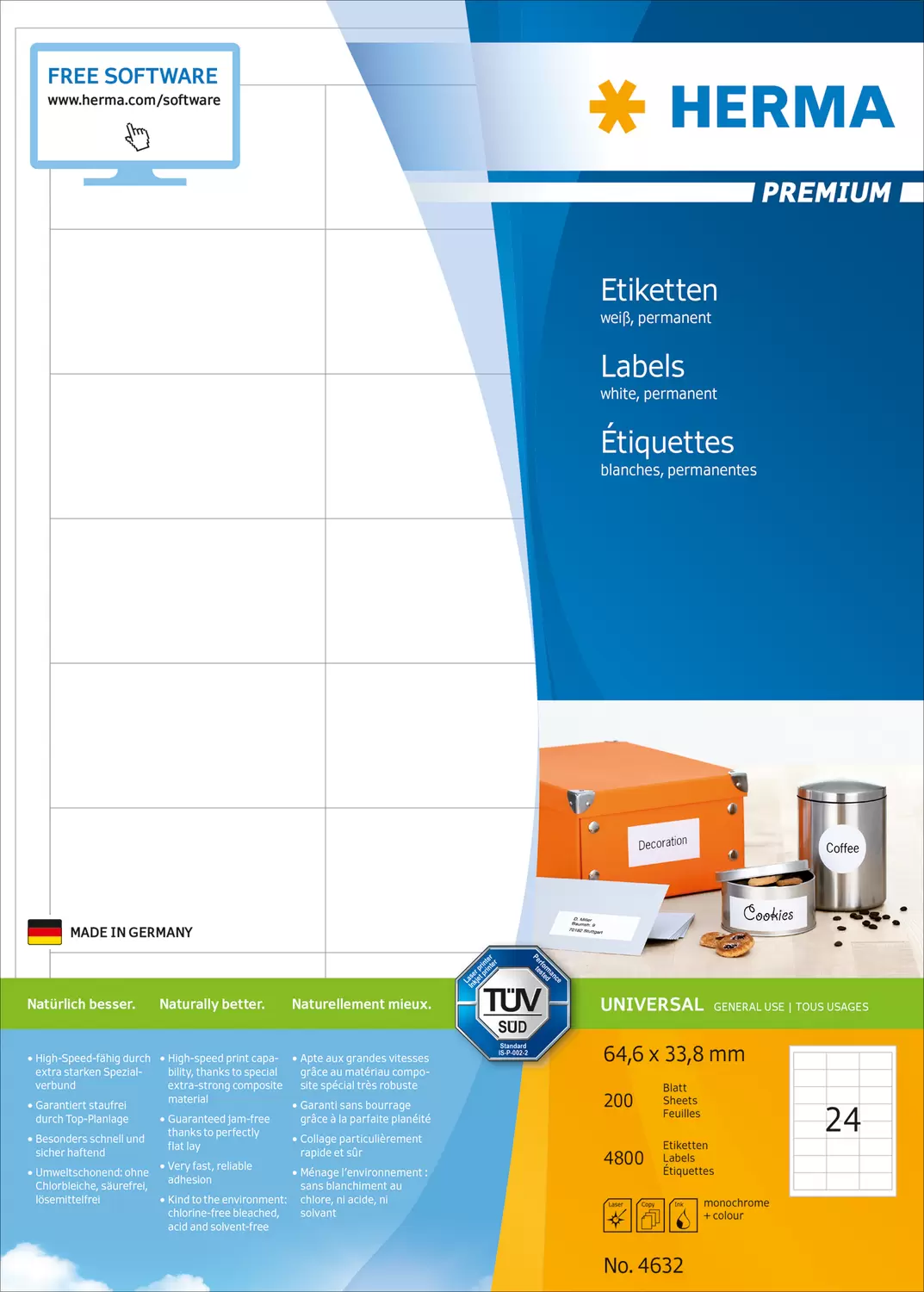 PREMIUM labels A4, 64,6 x 33,8 mm, white, permanent adhesion