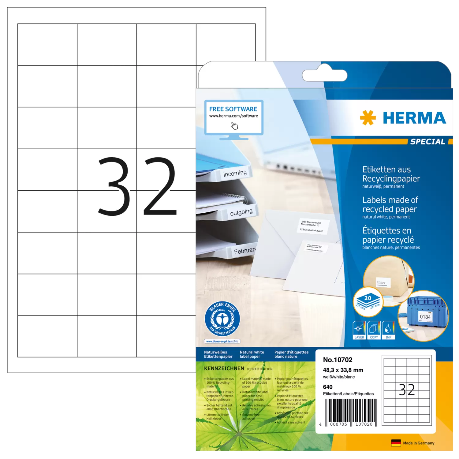 Labels made of recycled paper A4, 48,3 x 33,8 mm, white, permanent adhesion