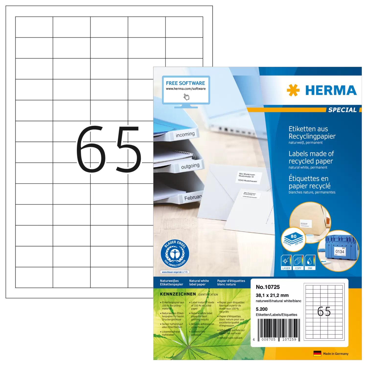 Self-adhesive labels made of natural white recycled paper, on A4 sheets. Awarded the Blue Angel ecolabel. Ideal for addressing and labelling. Label paper made exclusively from 100% recycled paper. High whiteness (ISO 97/CIE 133), no chlorine bleaches. Water-based, solvent-free adhesive, plasticizer-free and acid-free, safe to use with all foods. Labels are 100% recyclable, dispose of as for waste paper. Packaging made from recycled cardboard. Trouble-free processing thanks to all-round protective edge and optimum flatness. Excellent printing results on all laser printers, inkjet printers, copiers, colour laser printers and colour copiers. Free software solutions: www.herma.com/software.