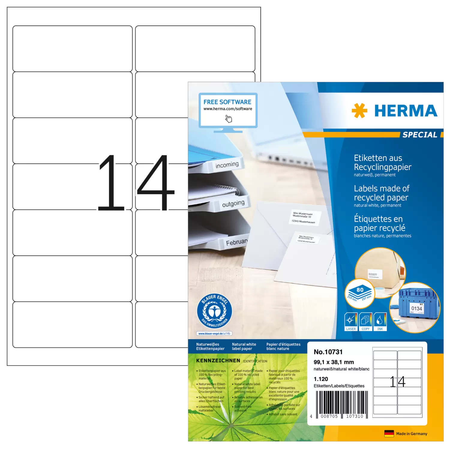 Self-adhesive labels made of natural white recycled paper, on A4 sheets. Awarded the Blue Angel ecolabel. Ideal for addressing and labelling. Label paper made exclusively from 100% recycled paper. High whiteness (ISO 97/CIE 133), no chlorine bleaches. Water-based, solvent-free adhesive, plasticizer-free and acid-free, safe to use with all foods. Labels are 100% recyclable, dispose of as for waste paper. Packaging made from recycled cardboard. Trouble-free processing thanks to all-round protective edge and optimum flatness. Excellent printing results on all laser printers, inkjet printers, copiers, colour laser printers and colour copiers. Free software solutions: www.herma.com/software.